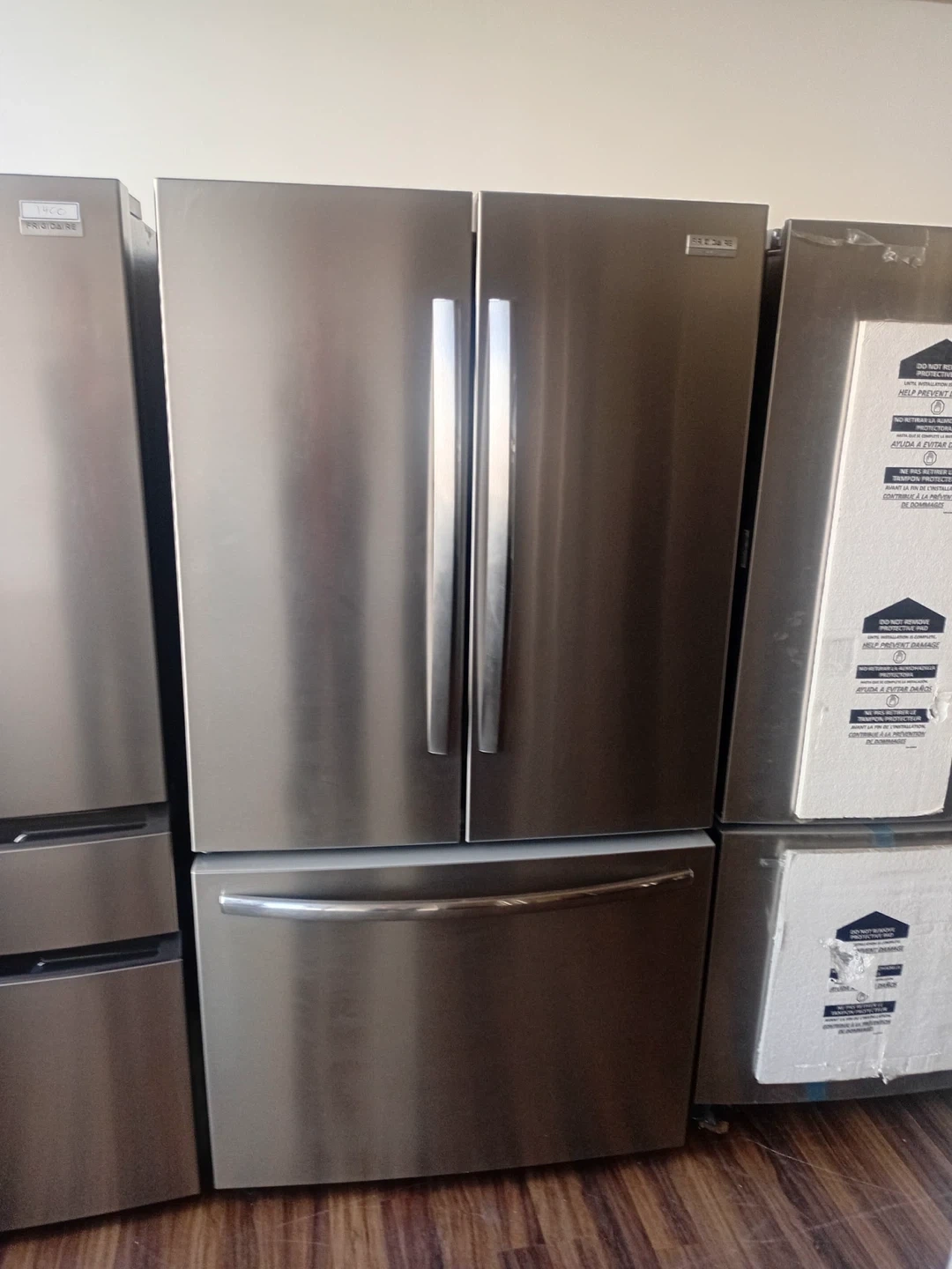 This is a New Stainless Steel Frigidaire refrigerator with a sleek design. It features a French door configuration and a bottom freezer & ready to keep your groceries fresh.