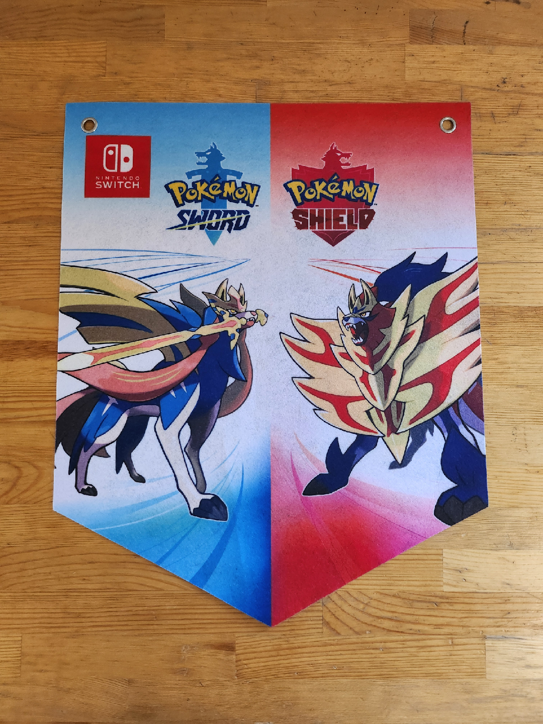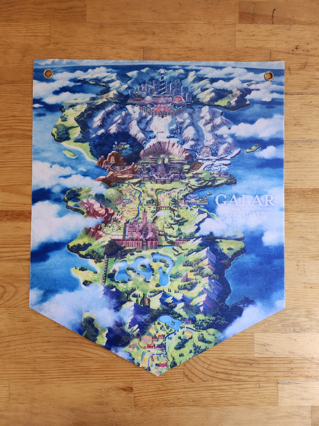 Selling a Pokémon Sword & Shield banner featuring the Galar region map on one side and the game logos with Zacian and Zamazenta on the other! It's in great condition and would be perfect for any Pokémon fan's room or game space!