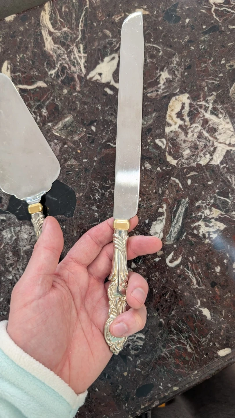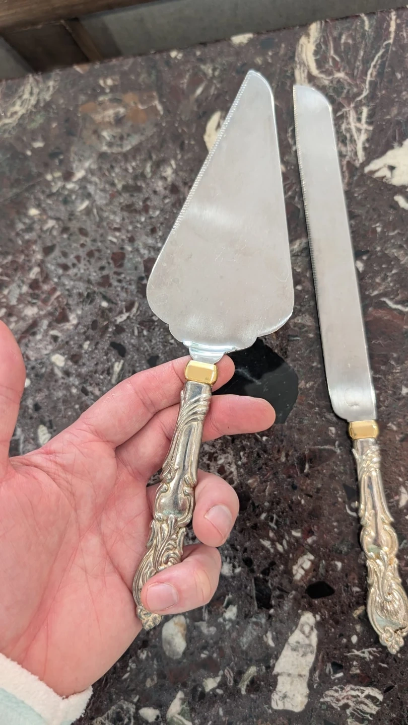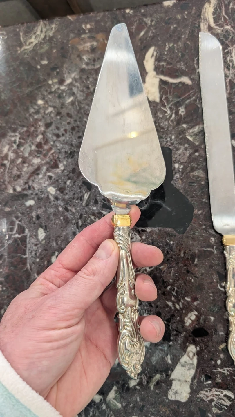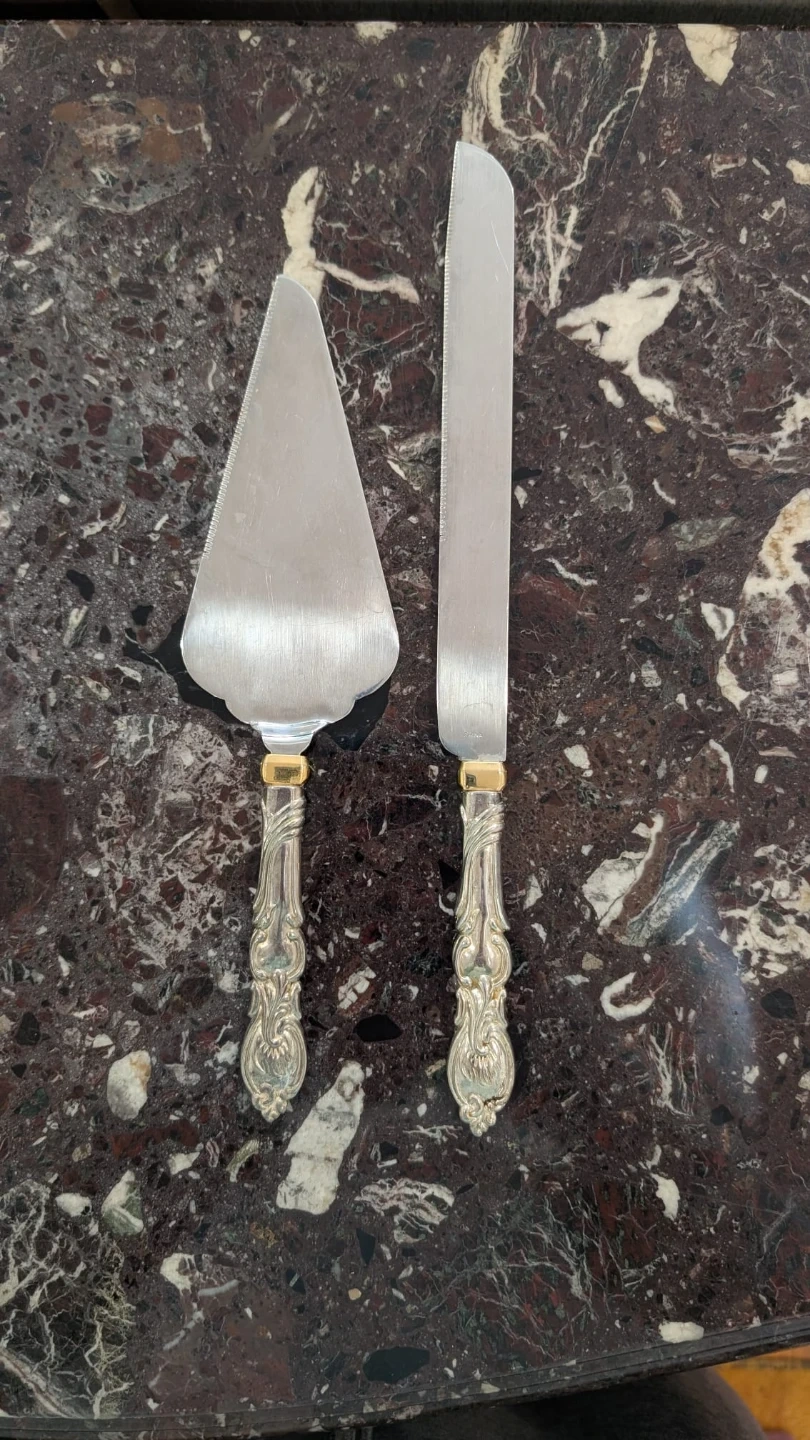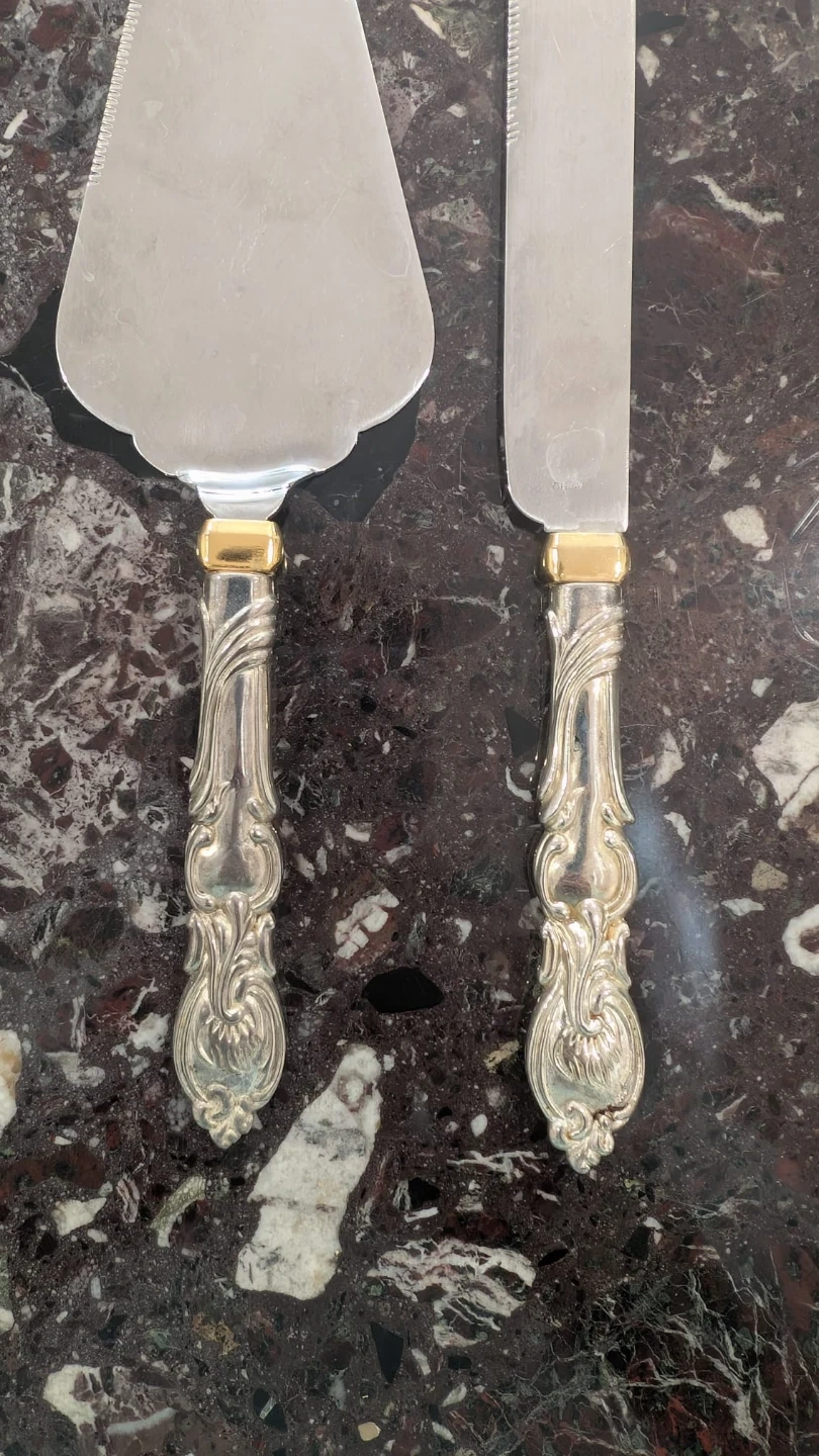 A lovely two-piece set for serving cake. It includes a cake server and a cake knife. The handles have an ornate design with gold-tone accents. These are silver in colour with gold coloured accents