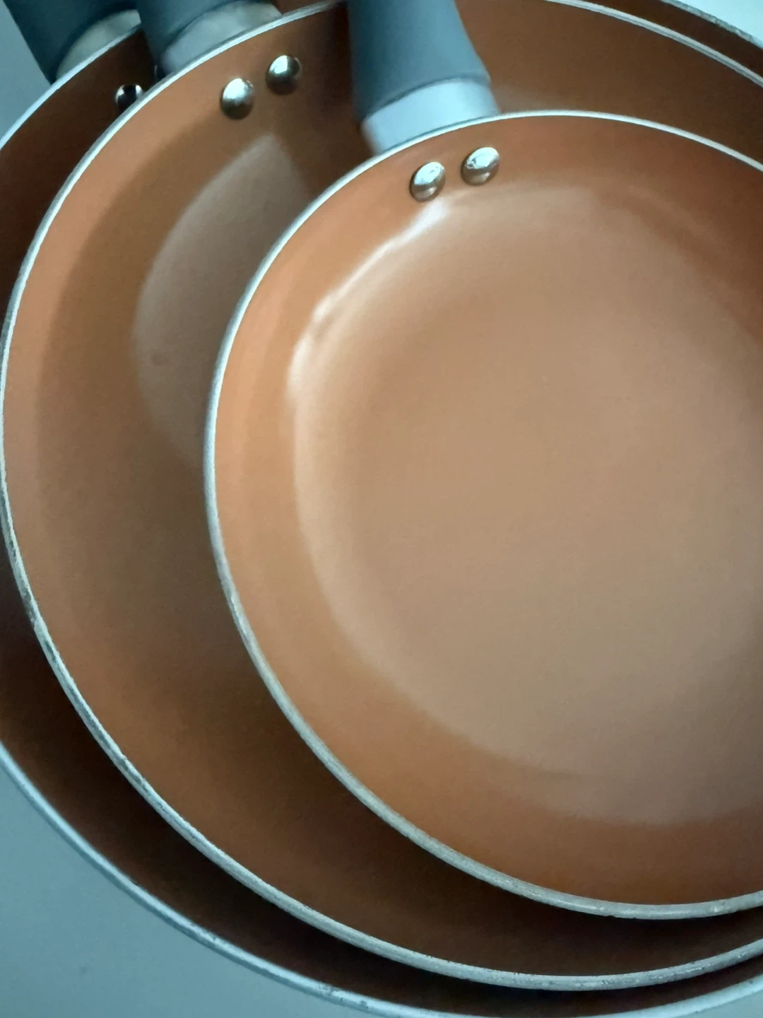Set of three copper-coloured ceramic nonstick frying pans. Features comfortable grey handles and induction bottoms. Great for everyday cooking!
