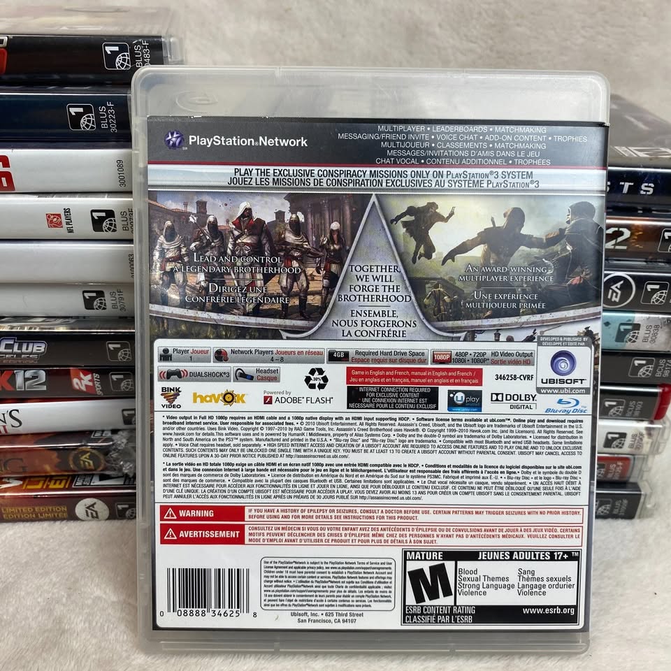 Dive into the vibrant and dangerous world of Renaissance Italy with Assassin's Creed: Brotherhood for the Sony PlayStation 3. As the titular character, Ezio Auditore, you'll navigate a complex web of intrigue and assassination, utilizing an arsenal of weapons and abilities. The game masterfully blends action, adventure, role-playing, and strategy, providing hours of engaging gameplay set in a richly detailed historical backdrop. This edition comes with exclusive content, enhancing your gameplay experience. The game is rated MA 15+ and ensures compatibility with NTSC-U/C systems in the US and Canada. Published by Ubisoft in 2010, this unit is a collector's edition, adding unique content to your gaming library. Experience the acclaim of a critically acclaimed franchise and step into the shoes of a legendary assassin.