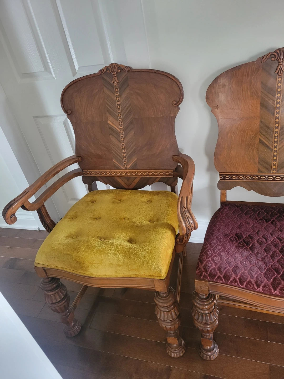 I'm selling a set of two used antique ornate wood chairs, perfect for adding a touch of vintage charm to any room. These chairs feature unique wood carvings and a distinctive design. While they show signs of wear consistent with their age, they remain sturdy and beautiful. The seat is upholstered with an eye-catching and decorative fabric. Perfect for a dining room or as accent pieces in your living space.
