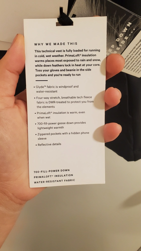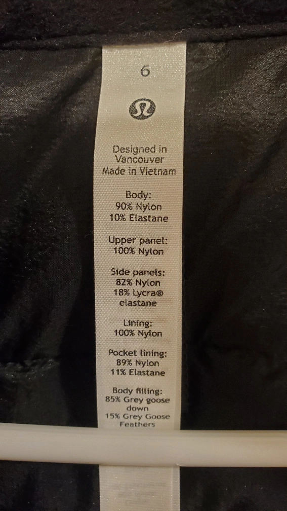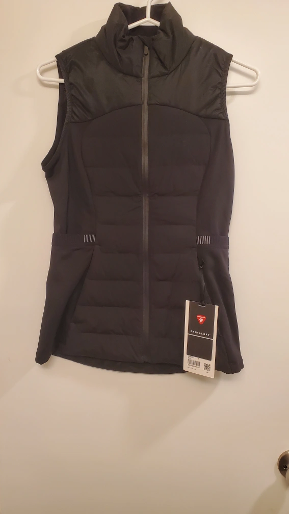 This is a brand new Lululemon vest with the tags still attached! It's a size 6 in black and features Primaloft insulation. The body is made of 90% nylon and 10% elastane, while the upper panel is 100% nylon. The side panels are 82% nylon and 18% Lycra elastane. It's designed in Vancouver and made in Vietnam