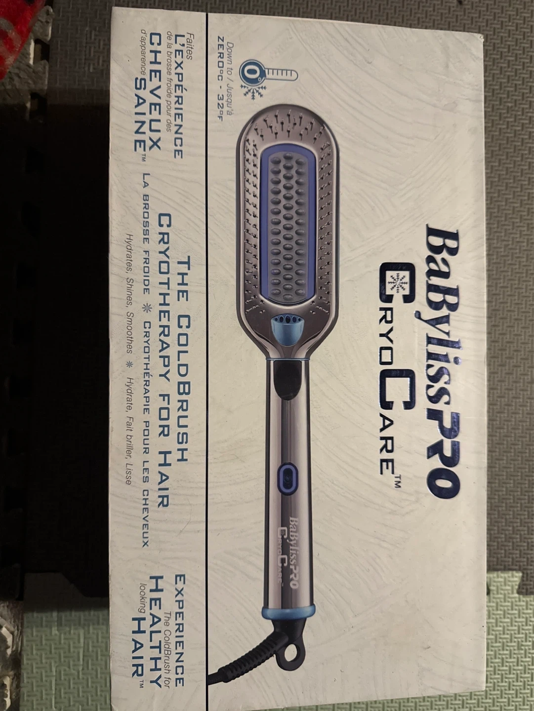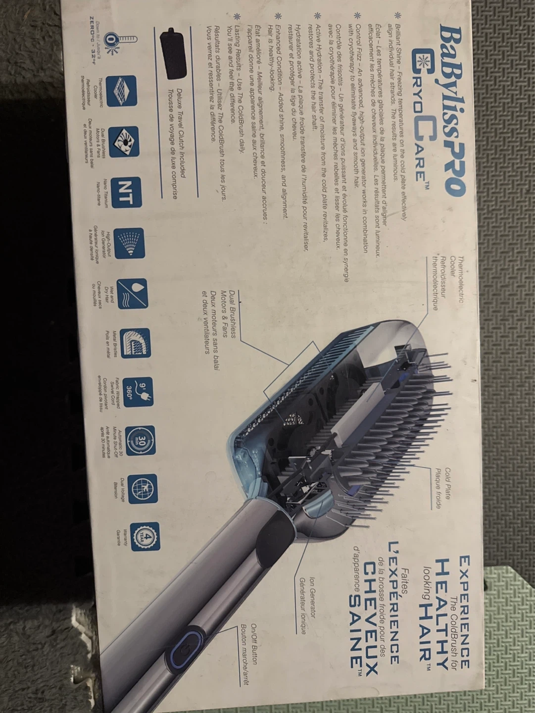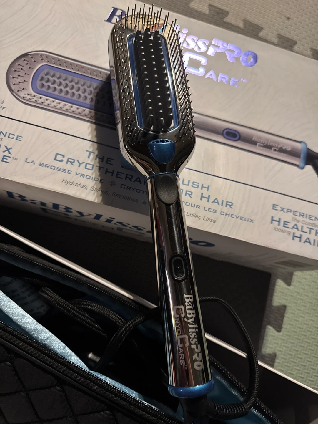 BaBylissPRO CryoCare Cold Brush for healthy looking hair. It hydrates, shines, and smooths hair with cryotherapy technology. This includes the brush, a travel pouch, and original box.