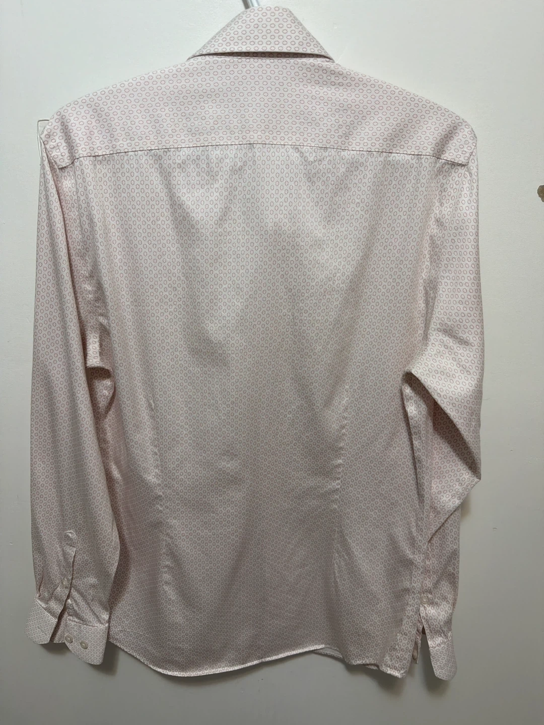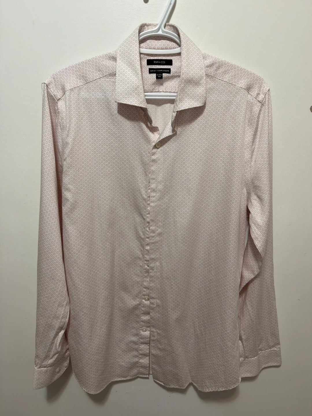 This RW&CO. dress shirt is a slim fit with a subtle pink geometric pattern. It's made from 100% cotton. It's a size Medium/Medium (15-15 1/2).