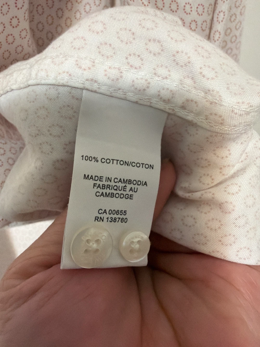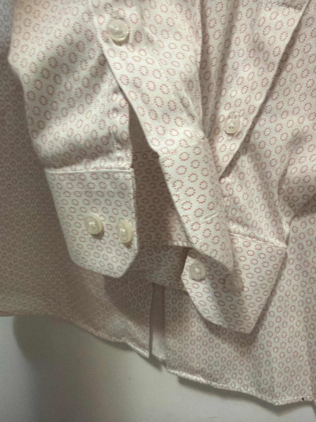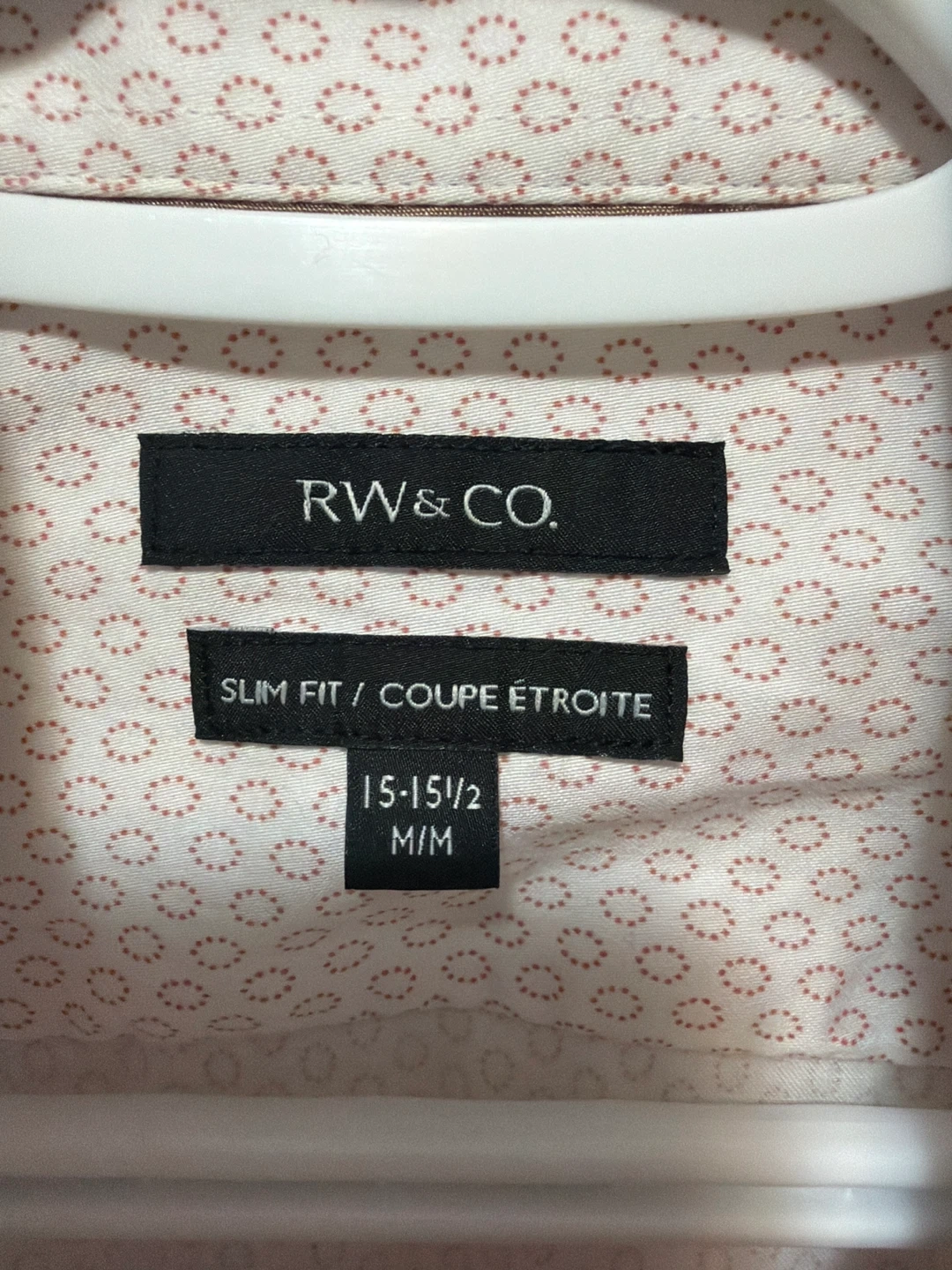 This RW&CO. dress shirt is a slim fit with a subtle pink geometric pattern. It's made from 100% cotton. It's a size Medium/Medium (15-15 1/2).