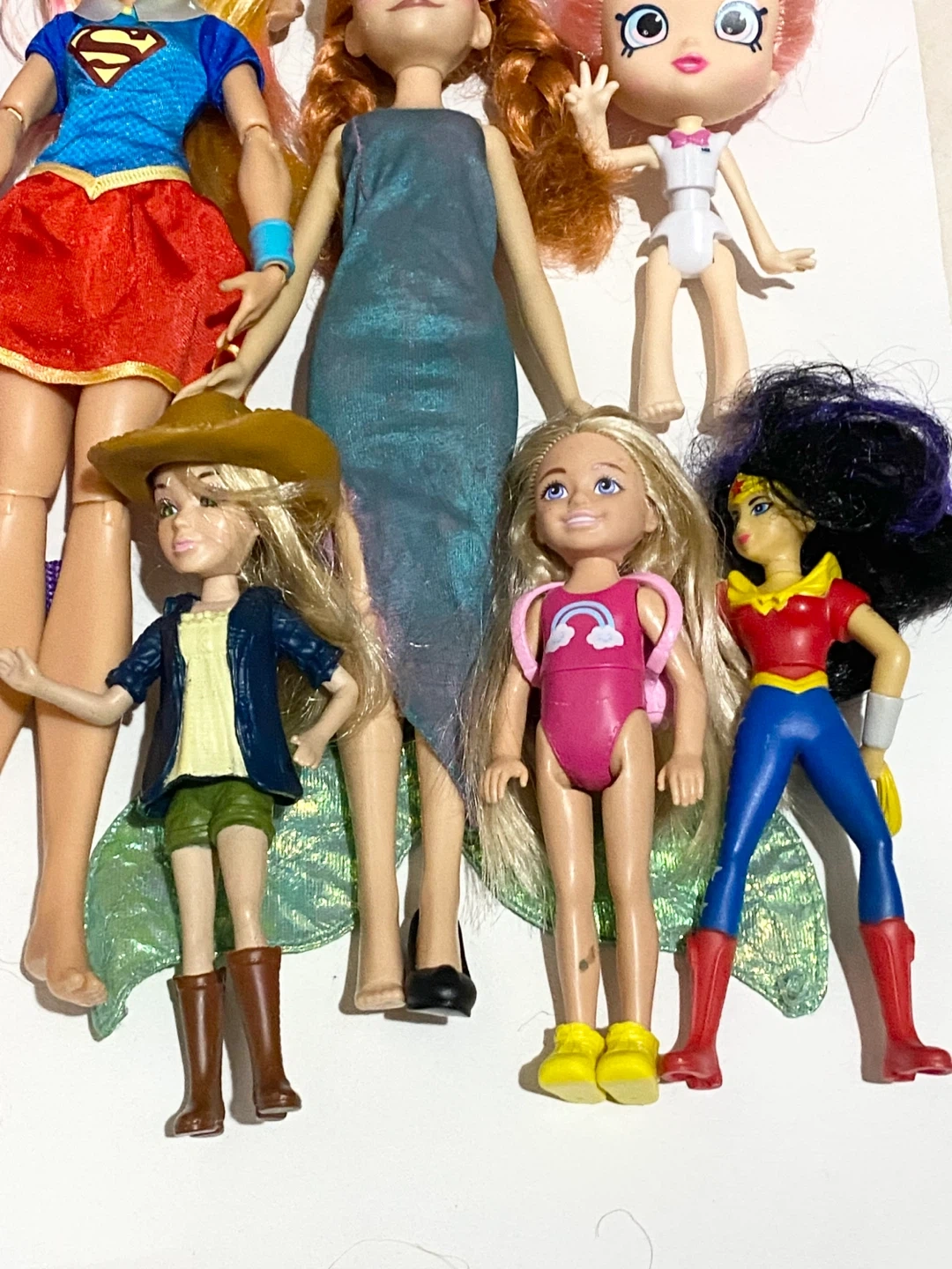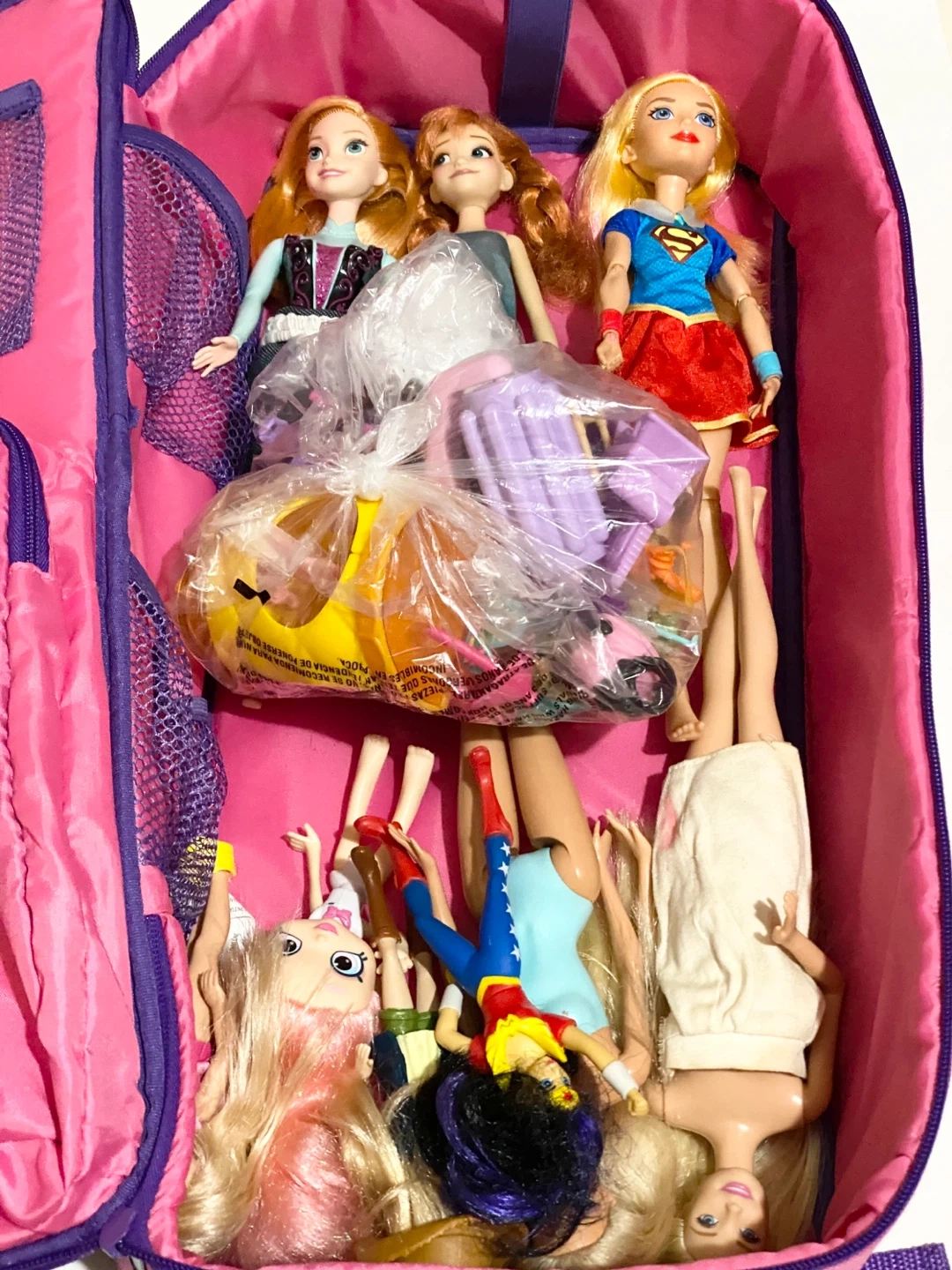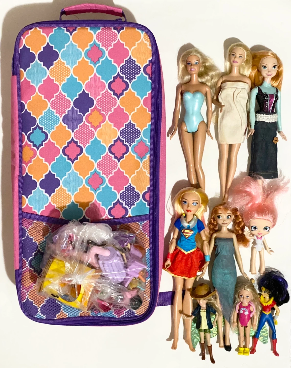 This lot includes a variety of dolls, some with distinct outfits like Supergirl and what appears to be a Disney character. A colourful carrying case with a patterned design and a mesh pocket is also included, along with a bag of doll accessories. The case has a handle for easy transport and measures 10”x 20”.