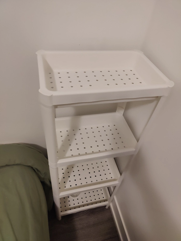 Four-tier shelving unit. White plastic. perforated shelves so good for bathroom storage of wet things. i just used for dry items, like new condition and very clean, only had for few months.