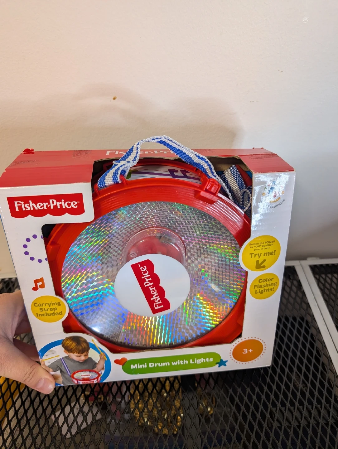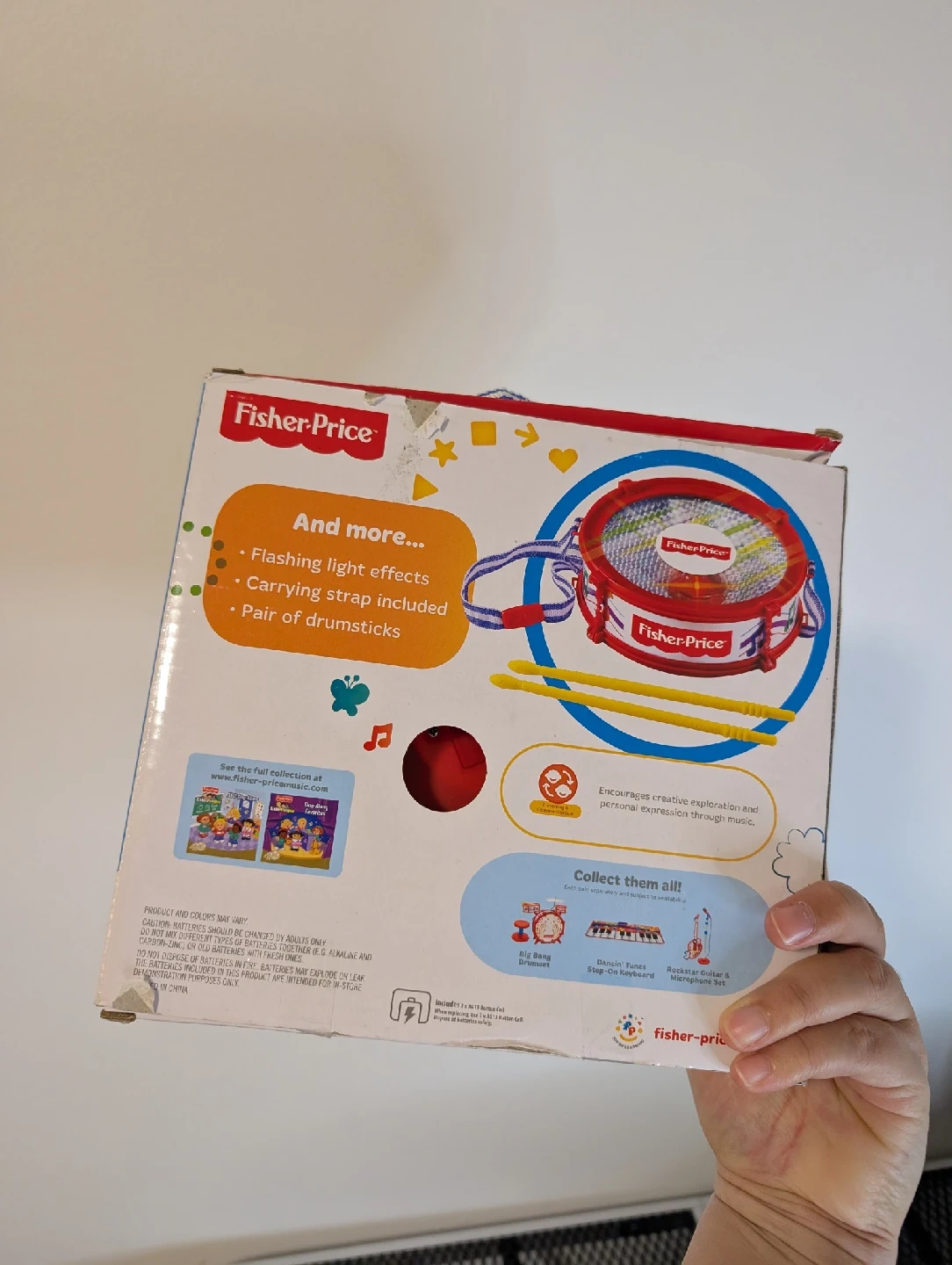 Brand new Fisher-Price Mini Drum with Lights, still in its original packaging! This cute drum features flashing lights and comes with a carrying strap and a pair of drumsticks. It's perfect for encouraging creative exploration and personal expression through music for little ones aged 3+