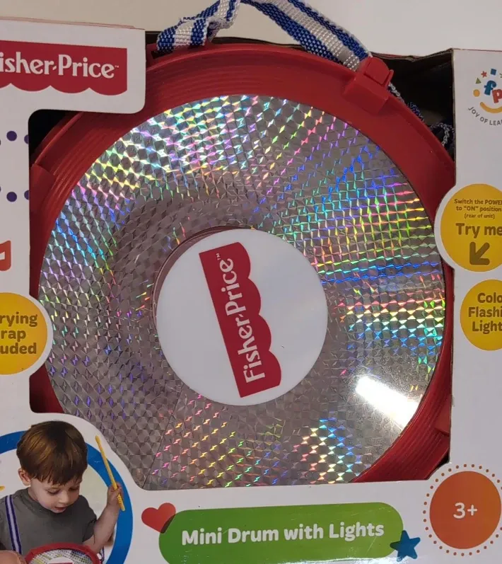 Brand new Fisher-Price Mini Drum with Lights, still in its original packaging! This cute drum features flashing lights and comes with a carrying strap and a pair of drumsticks. It's perfect for encouraging creative exploration and personal expression through music for little ones aged 3+