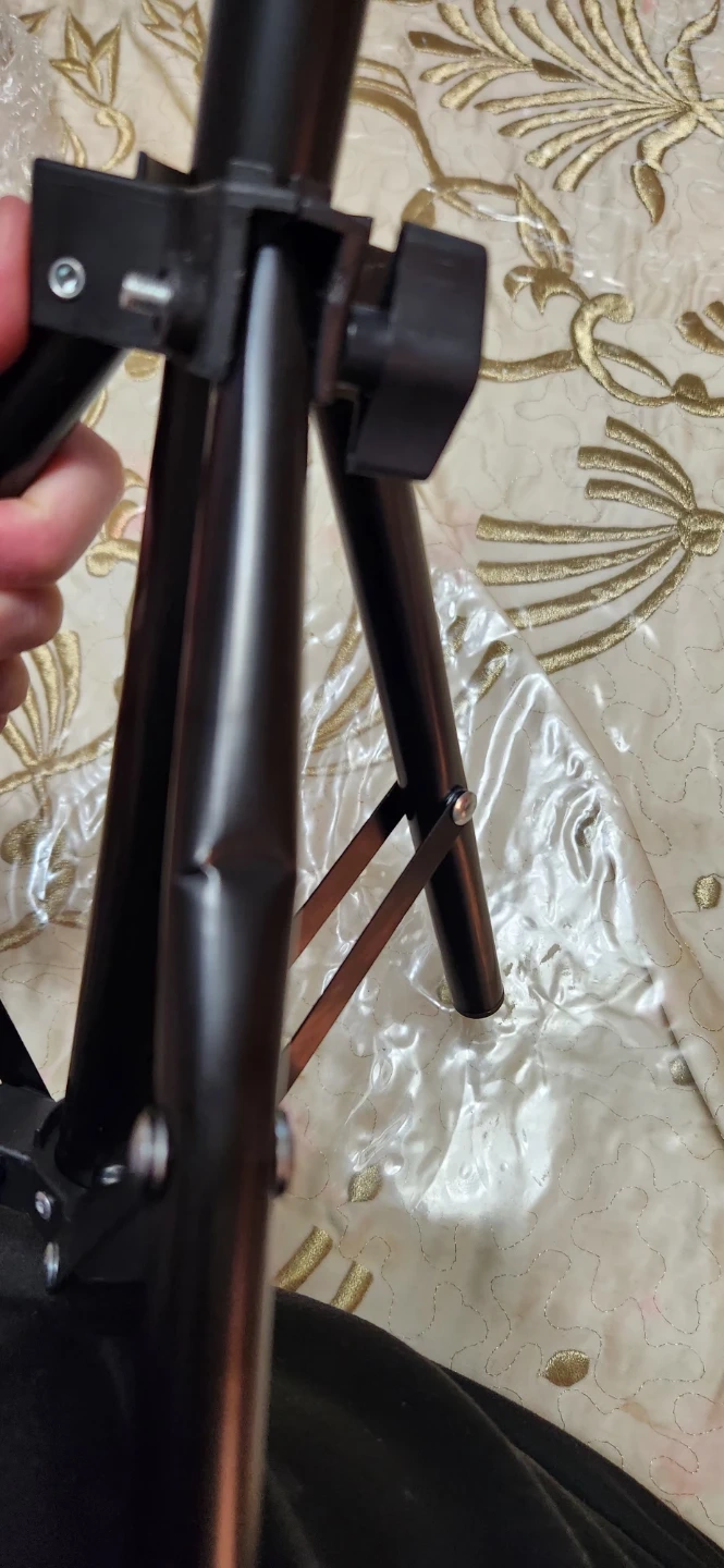 This is a black photography light stand with a tripod base. It's made of metal and folds down for storage. This stand is useful for supporting lighting equipment during shoots.