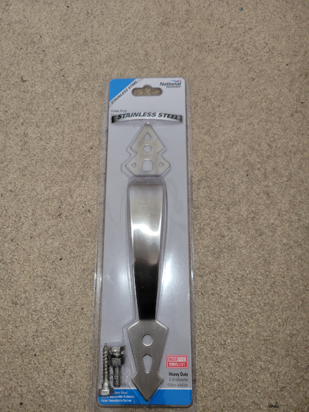 Selling a brand new National Hardware gate pull made of stainless steel. It's heavy duty and rust resistant, ensuring it's vinyl safe. Includes the necessary screws for installation. Perfect for adding a sturdy and stylish handle to your gate