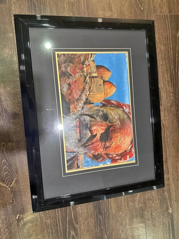 Striking framed artwork featuring an expressive portrait of an elder with a traditional head covering, set against a backdrop of stone village architecture. Bold colors and a textured brush-style print give this piece a powerful, artistic look. Professionally framed with a glossy black frame and double matting (grey with gold trim). Ready to hang. Details: Type: Art print (not an original painting), Style: Middle Eastern / Mediterranean / cultural portrait, Frame Size: 28” × 22”, Finish: Gloss black frame, double-matted, Condition: Great condition, clean, no damage. Perfect statement piece for living rooms, hallways, offices, or modern eclectic décor. Pickup available.