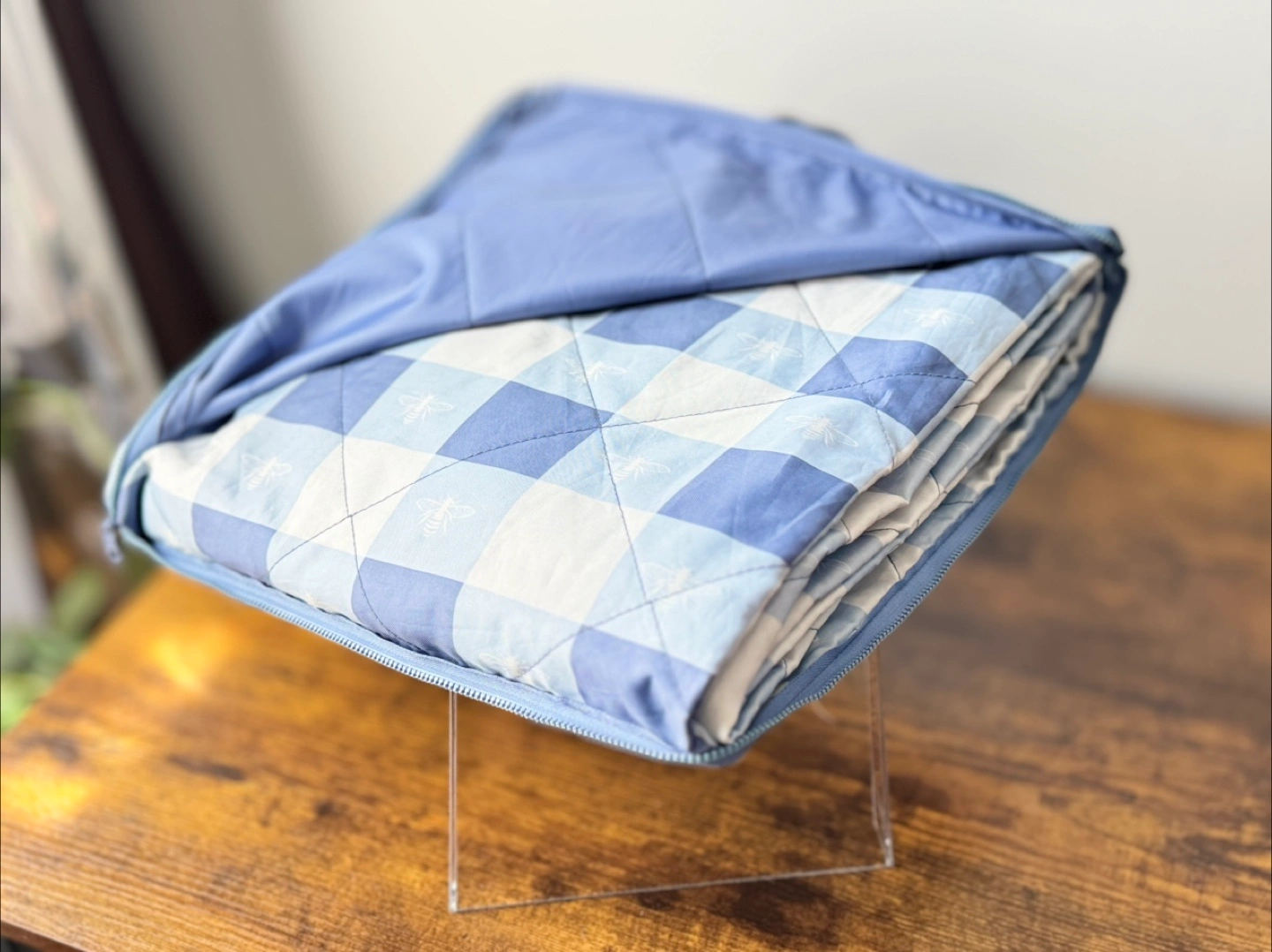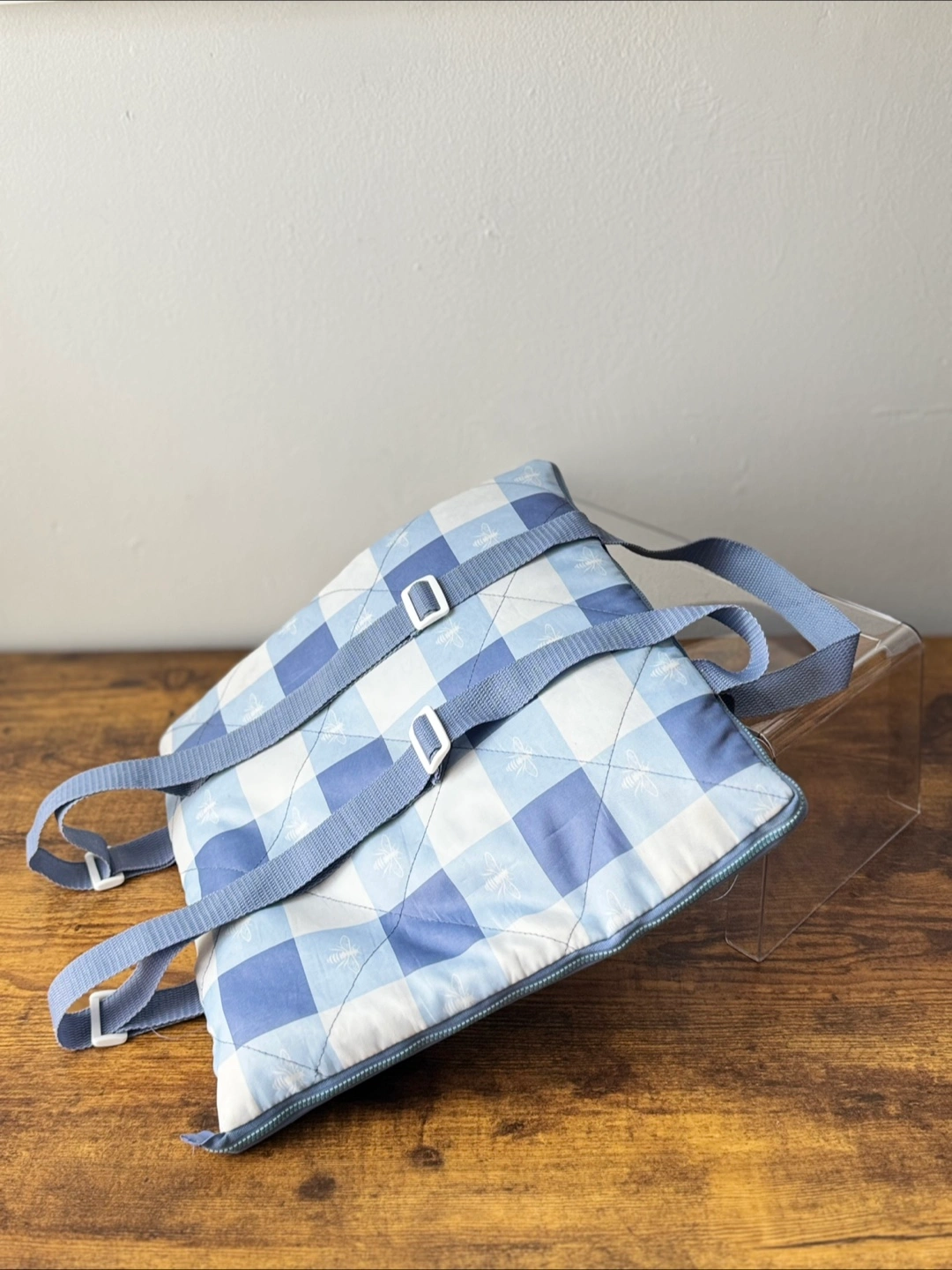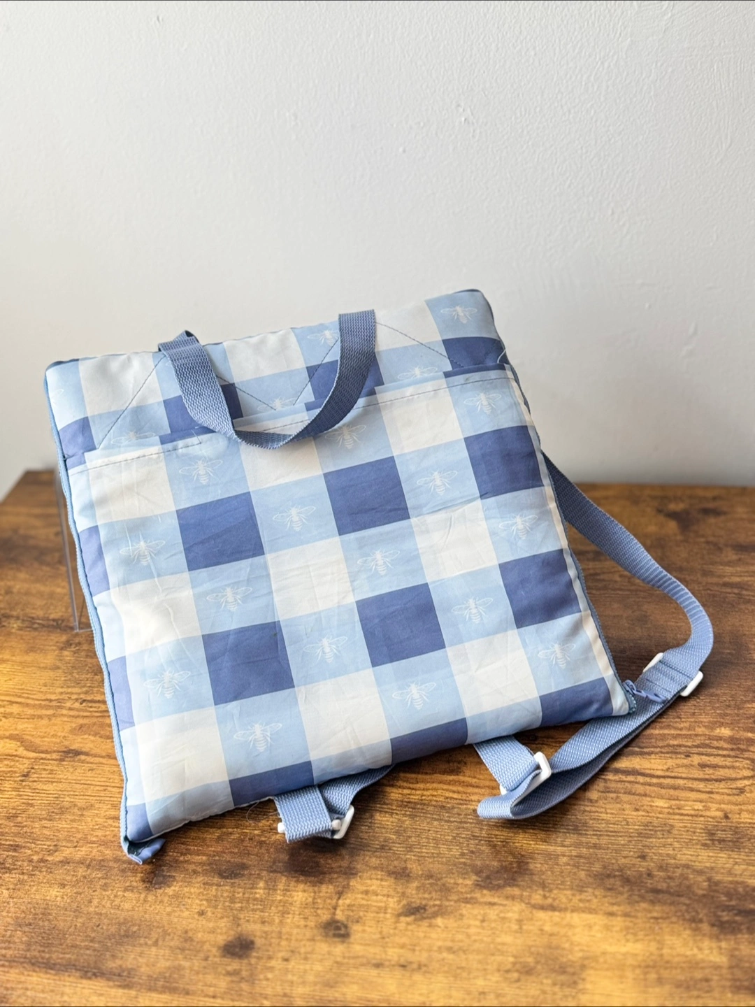Portable compact quilted picnic blanket. Features a gingham pattern with bees. Convenient backpack straps. Zipper closure. Perfect for outdoor adventures. Water resistant.