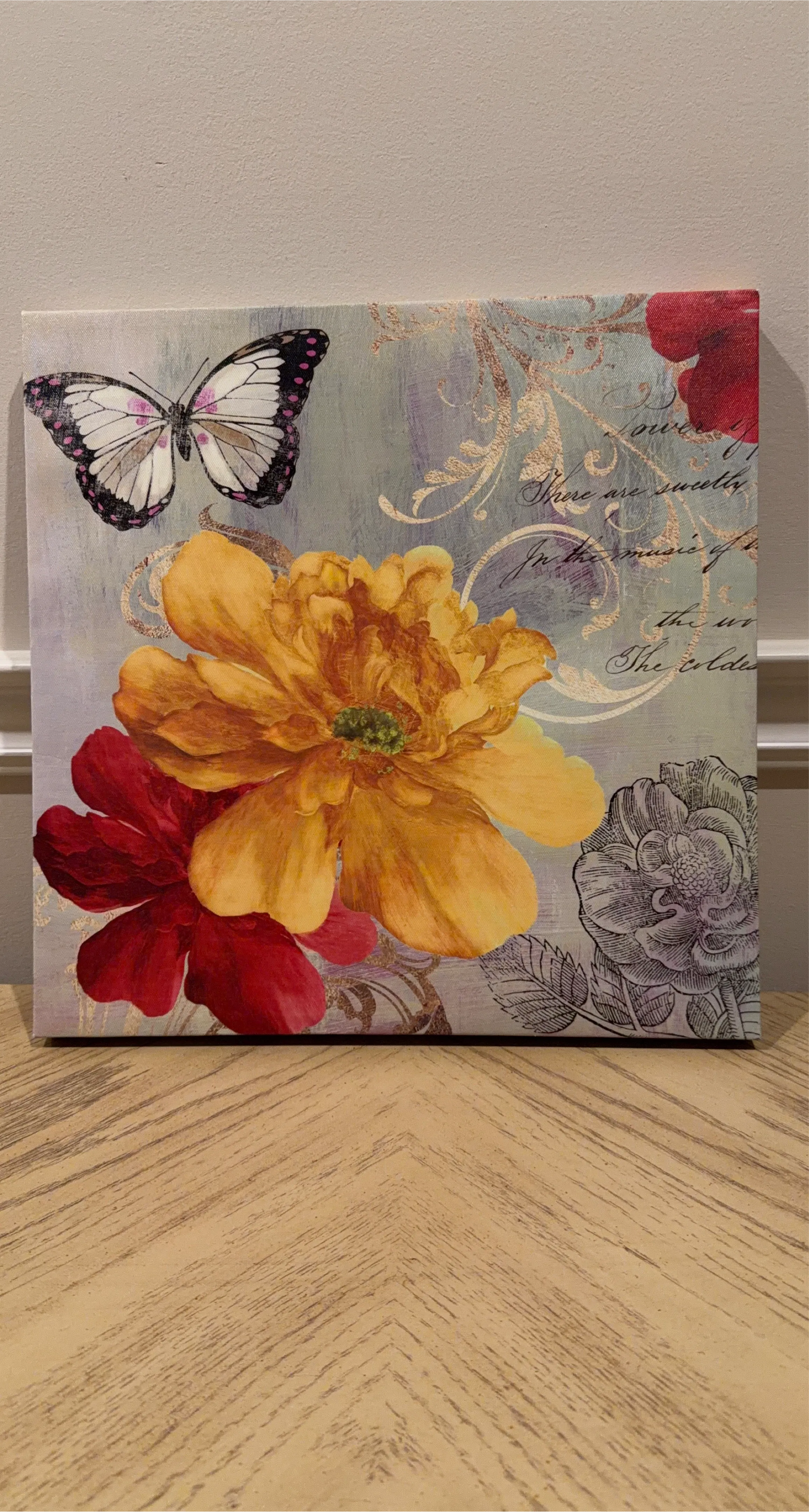 Beautiful canvas wall art featuring a butterfly and floral design. It would look great in any room!