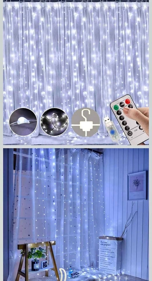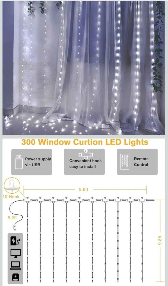 These are 3M x 3M (9.8ft x 9.8ft) curtain lights with 300 LEDs and an extra 8.2 ft long power cable. They come with 10 hooks. The lights don't overheat and produce a pleasant brightness. You can choose from 8 lighting modes: Combination, In wave, Sequential, Slowly glow, Chasing/Flash, Slow fade, Twinkle/Flash, Steady On. Modes can be changed using the remote or the button on the USB. There's also a timer function (6 or 18 hours) and 5 brightness levels. They are USB powered, making them convenient to use with power banks, chargers, or laptops. These lights create a lovely and cozy ambiance indoors and outdoors for gardens, bedrooms, living rooms, weddings, Christmas, and Halloween. The lights are IP65 waterproof, suitable for any weather (just keep the USB port dry). They are safe to touch and work well even in cold weather. Made of soft copper wire, they are perfect for DIY projects and can be hung on walls, windows, doors, floors, ceilings, trees, etc. Located in Crowsnest Pass.
