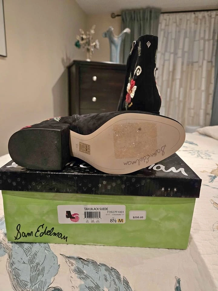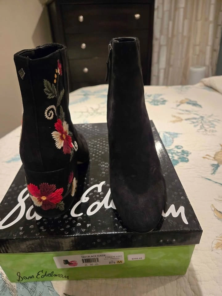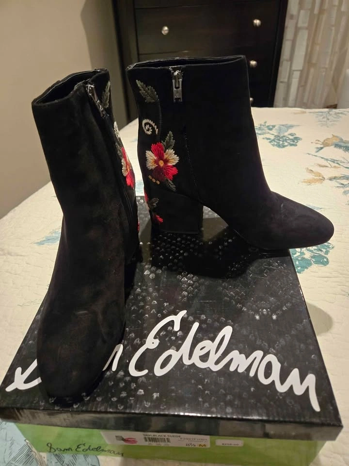 Ladies ankle boots with zipper, block heel and flowers embroidered on the back and sides. Never worn and still in the box.