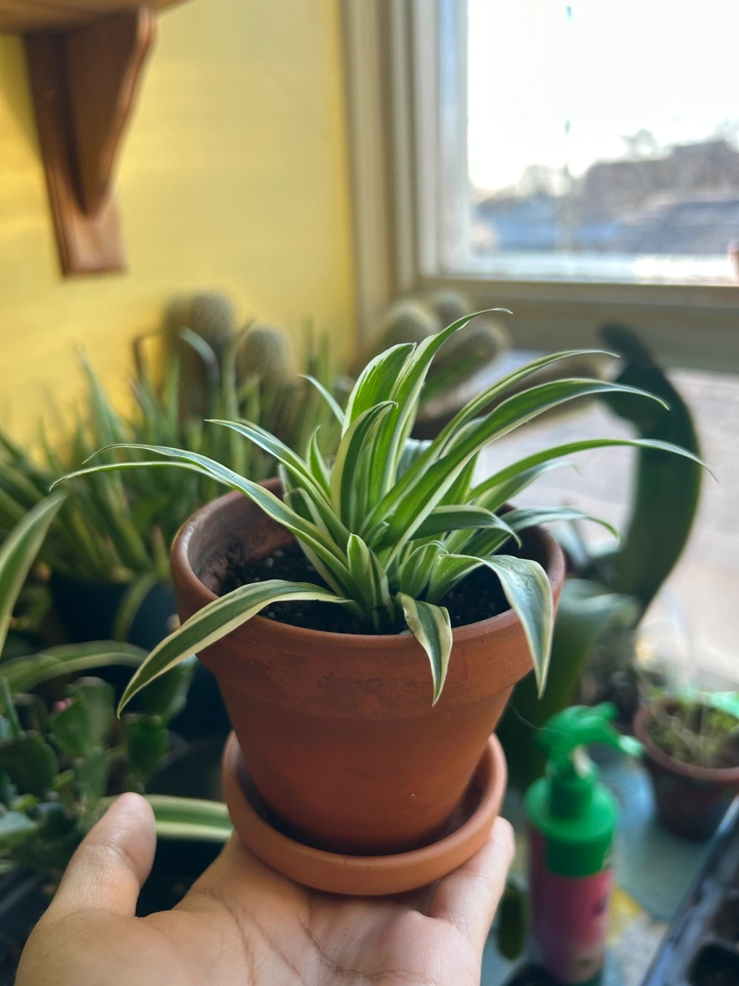 This is a vibrant spider plant with striped leaves, potted in a classic worn out terracotta pot with a matching saucer. It's a young plant, ready to thrive in a new home. Spider plants are known for their air-purifying qualities!