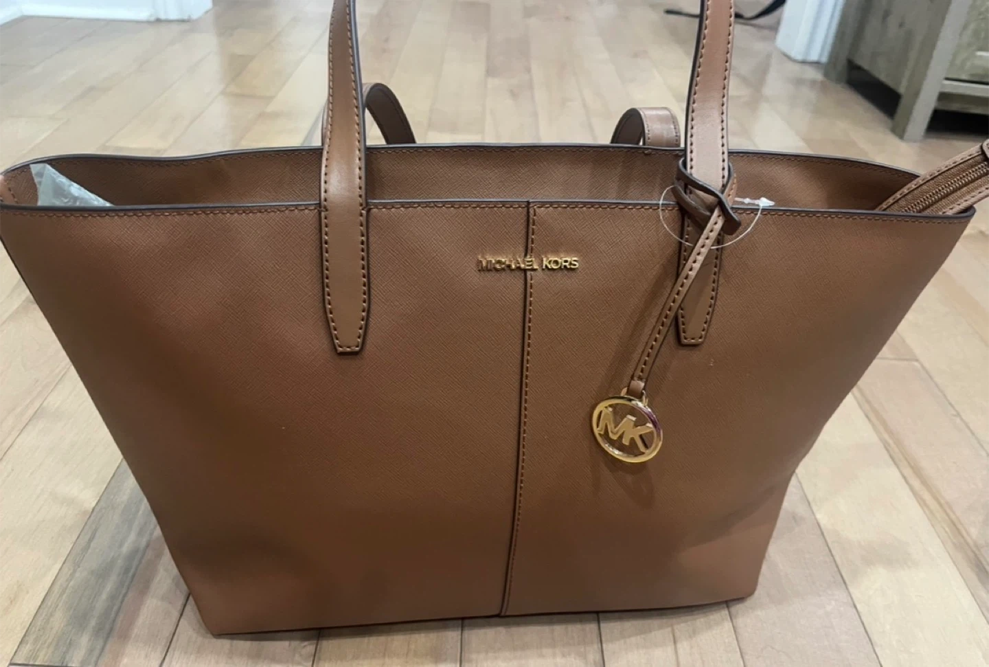 It's a brown Michael Kors tote bag. The material is cross-grain leather. This bag has a zip top closure and interior pockets. It's great for everyday use!