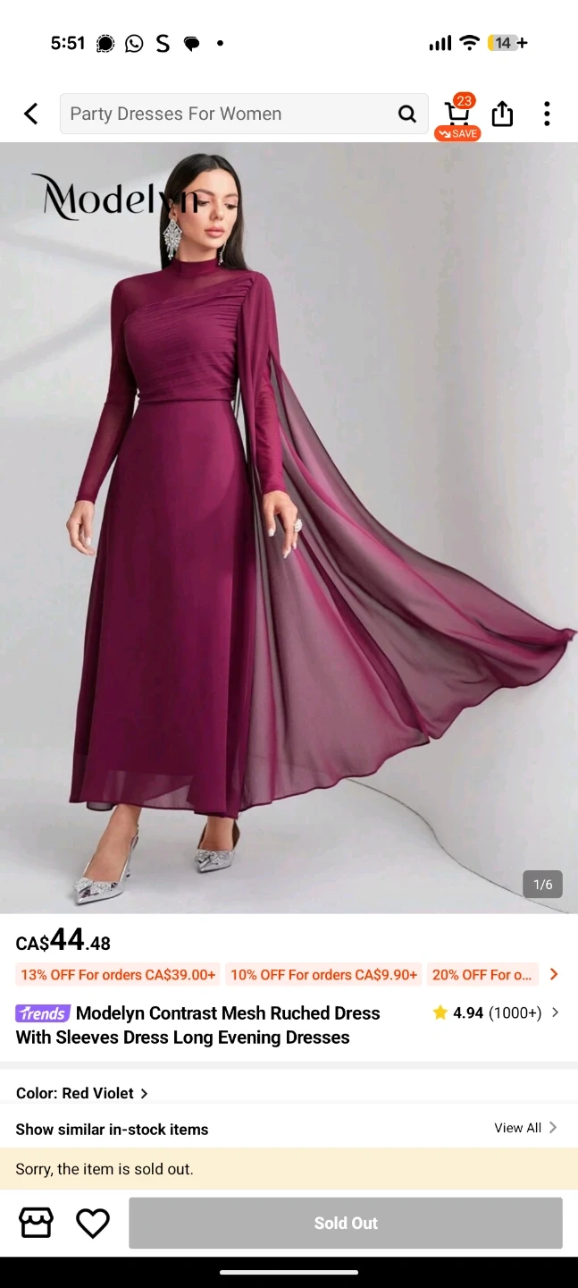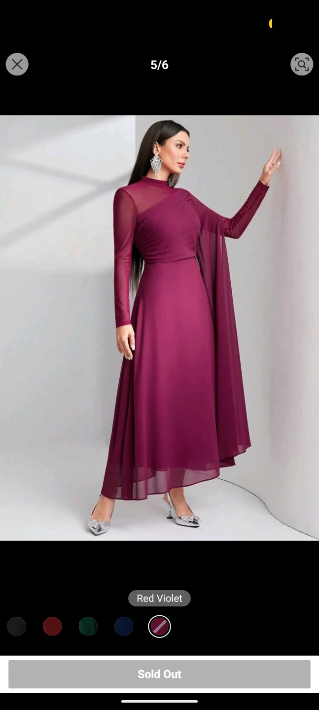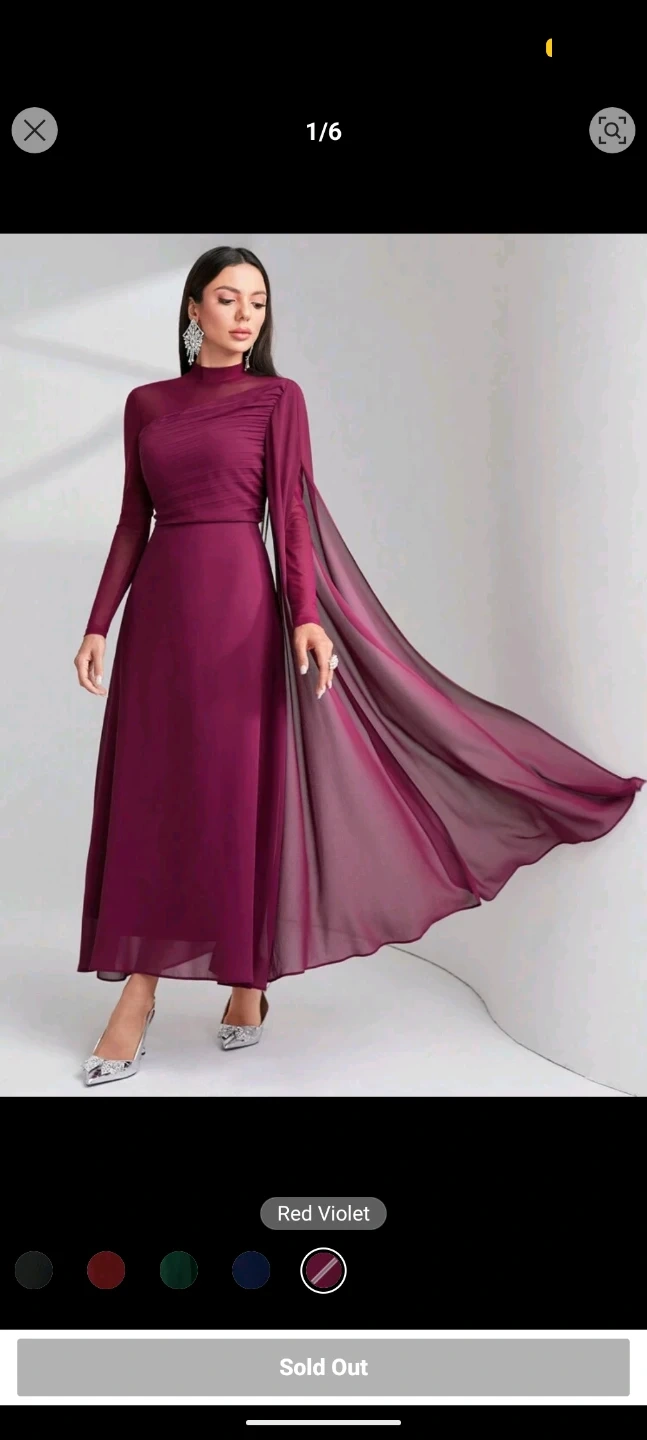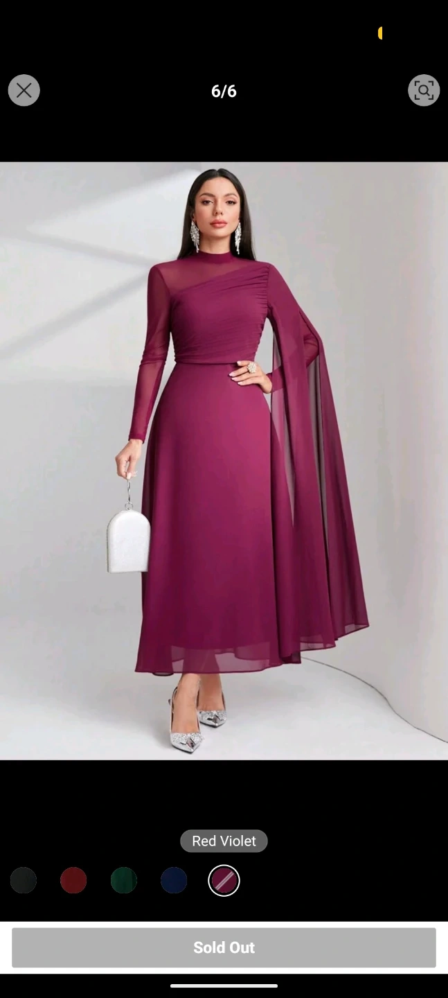 Elegant long-sleeved dress in a deep red violet hue. Features a mock neck and flowy chiffon cape detail. Perfect for special occasions!