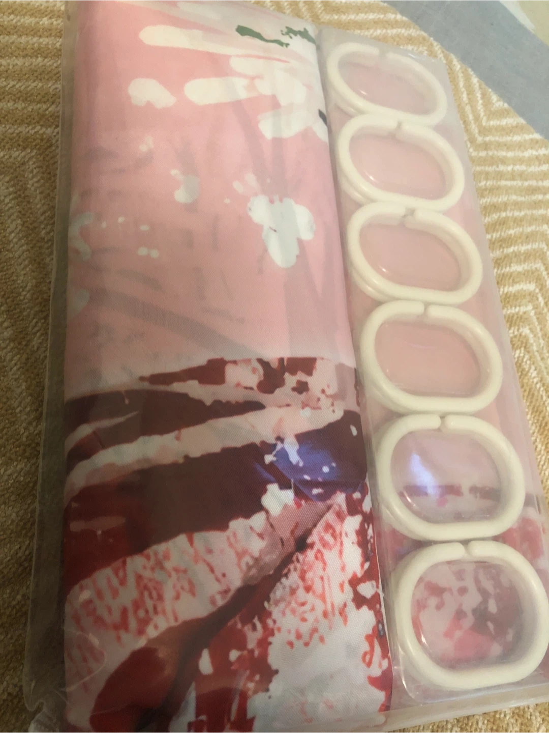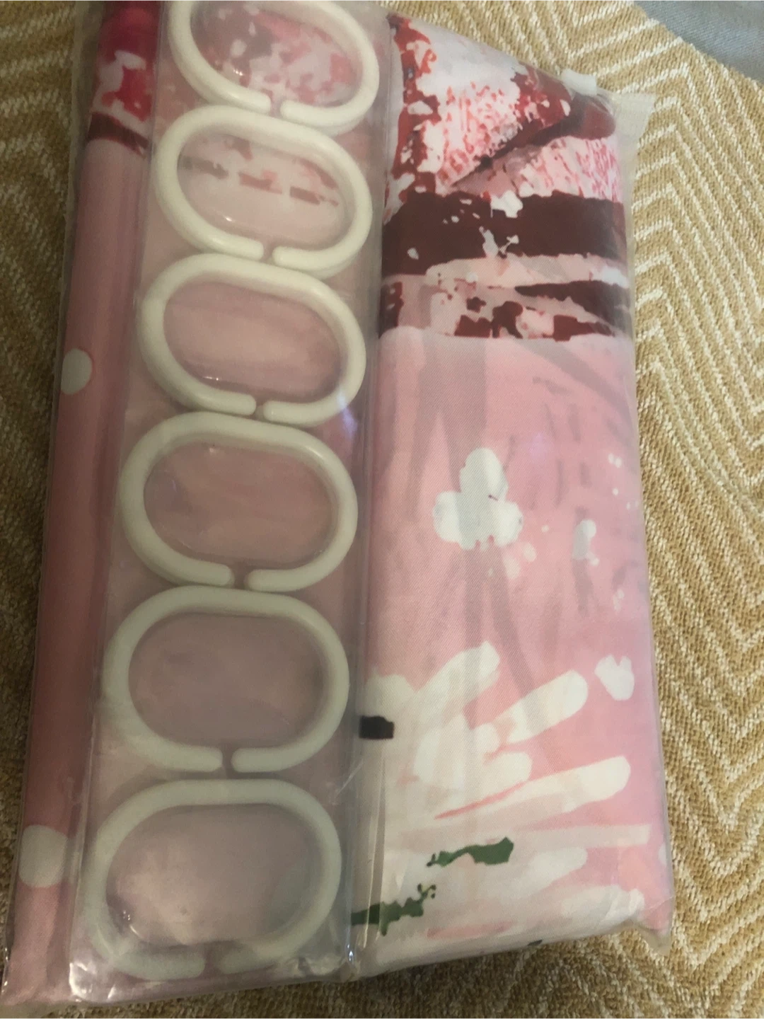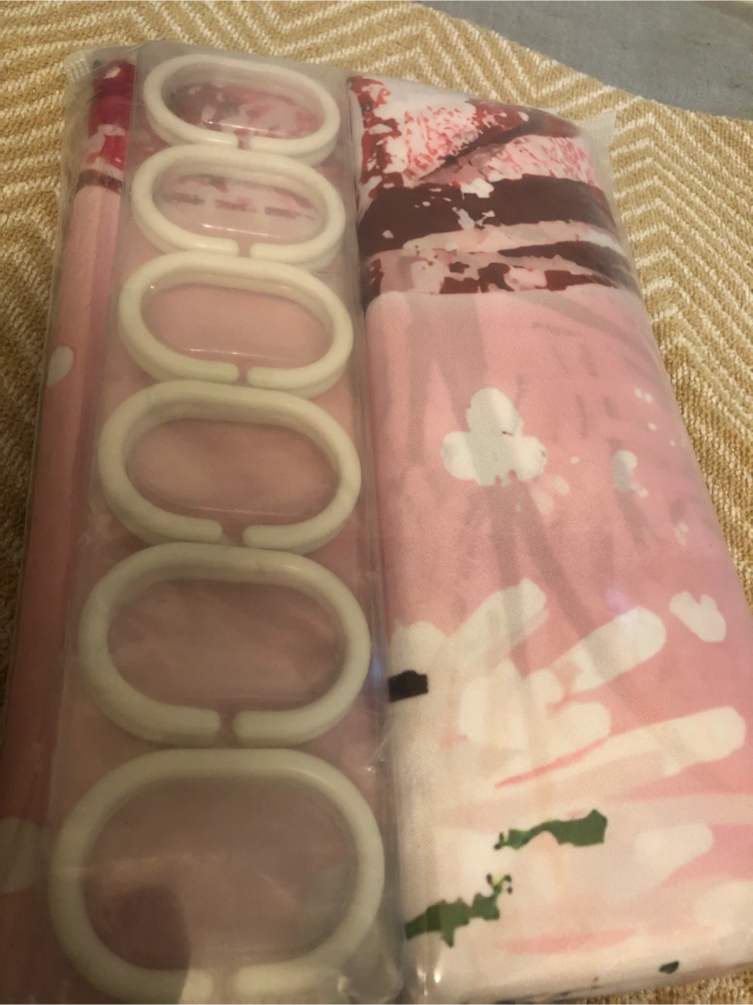 Brand new shower curtain still in its original packaging! It features a lovely pink floral pattern and comes with the necessary rings for easy installation. Made of polyester, it's ready to brighten up your bathroom!