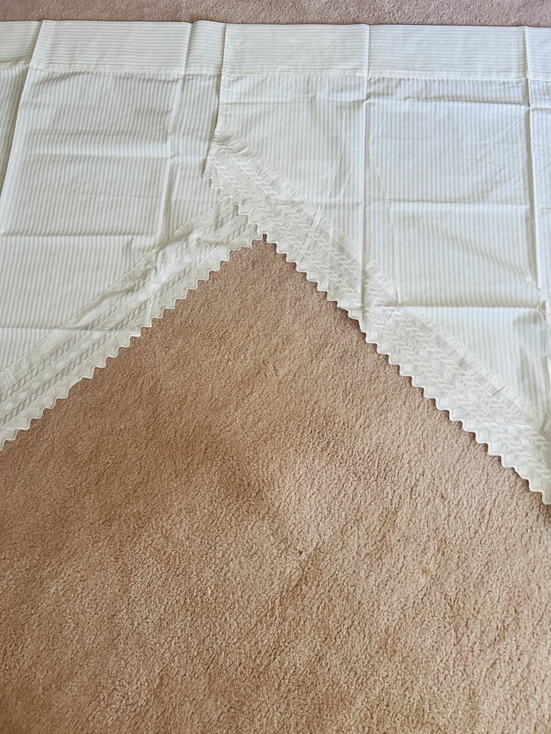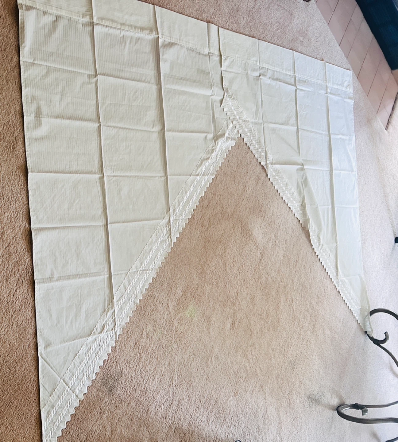 Each panel measures 48 inches wide by 65 inches long at longest peak. The cotton lace along edges is about 5 inches wide