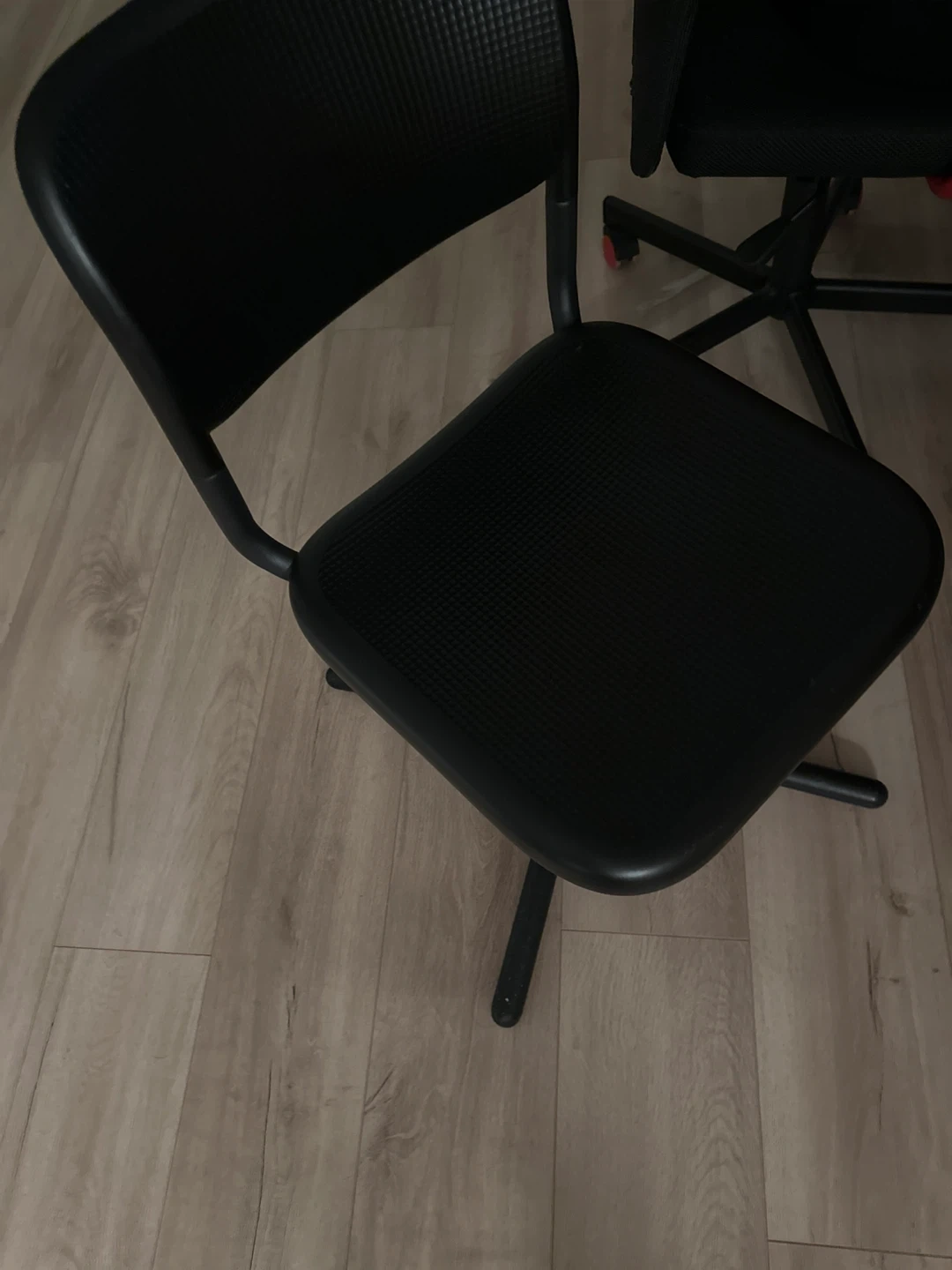 This is a black office chair. It's made of durable plastic and metal. The chair has a five-star base with wheels for easy mobility. It's suitable for a home office or workspace.