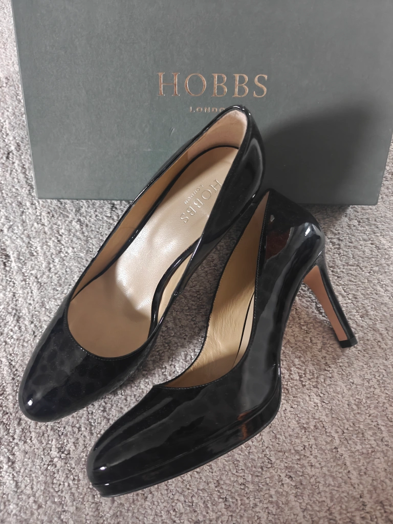 18Selling a pair of Hobbs London heels in black patent leather. They come with the original box. Perfect for a night out or a special occasion!