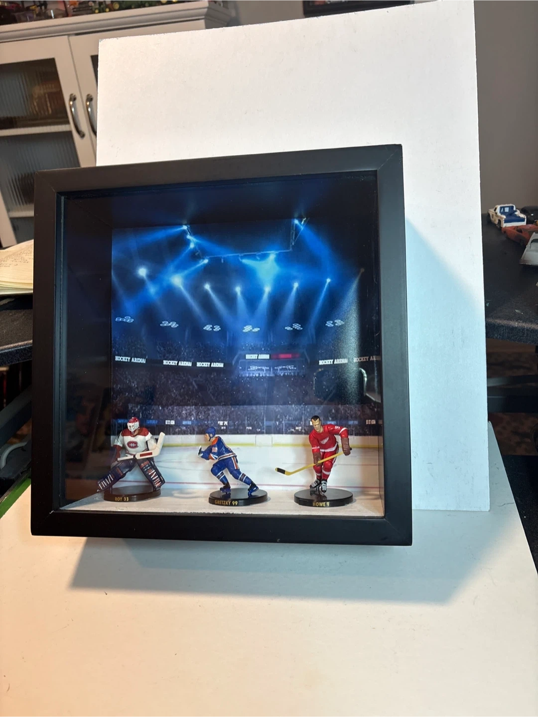 70Selling a shadow box featuring a hockey arena backdrop and figurines of hockey legends. The display includes figures of Roy 33, Gretzky 99, and Howe 9. A cool piece for any hockey fan! This is a hand made artwork
