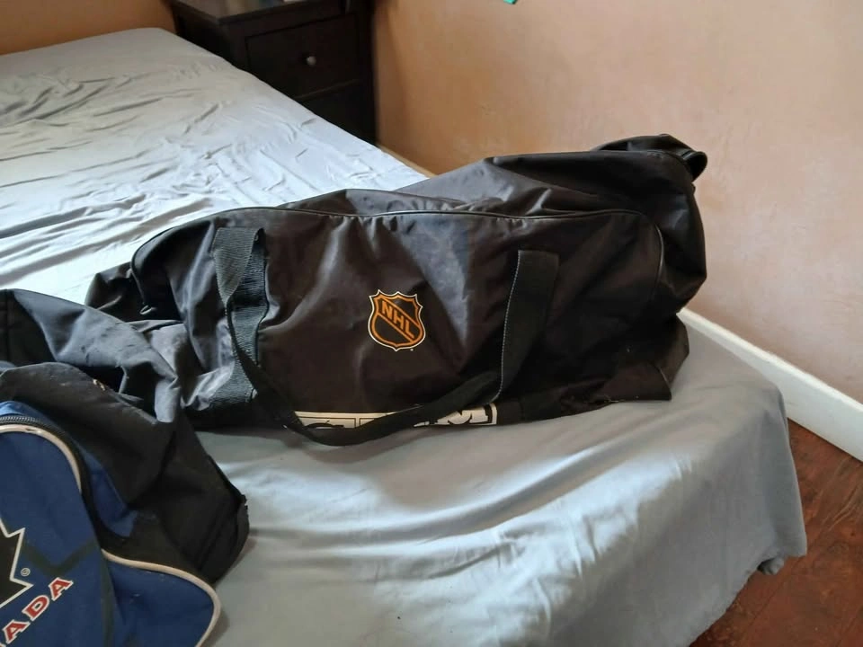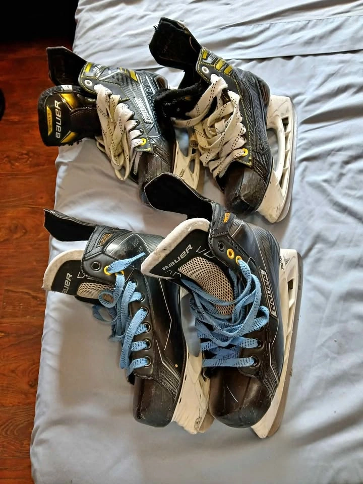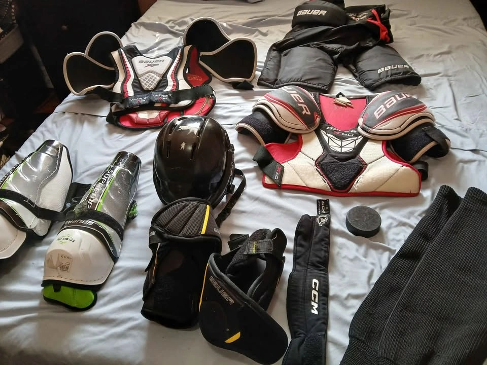 Can sell all together or individual. Skates are size 4.5 and 5.5. Most equipment is junior large. Buy all together get bag for free.