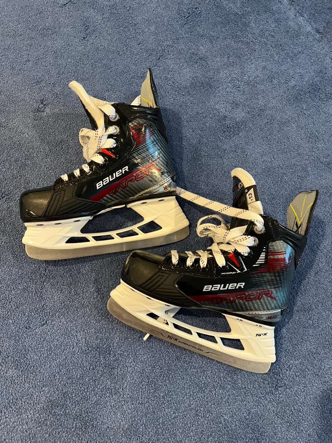 10Selling a pair of Bauer Y13 hockey skates. They are in perfect condition and ready for the ice! Only worn for 6 x 30min lessons. The skates are black, red, and silver. They feature the TUUK Lightspeed Edge.