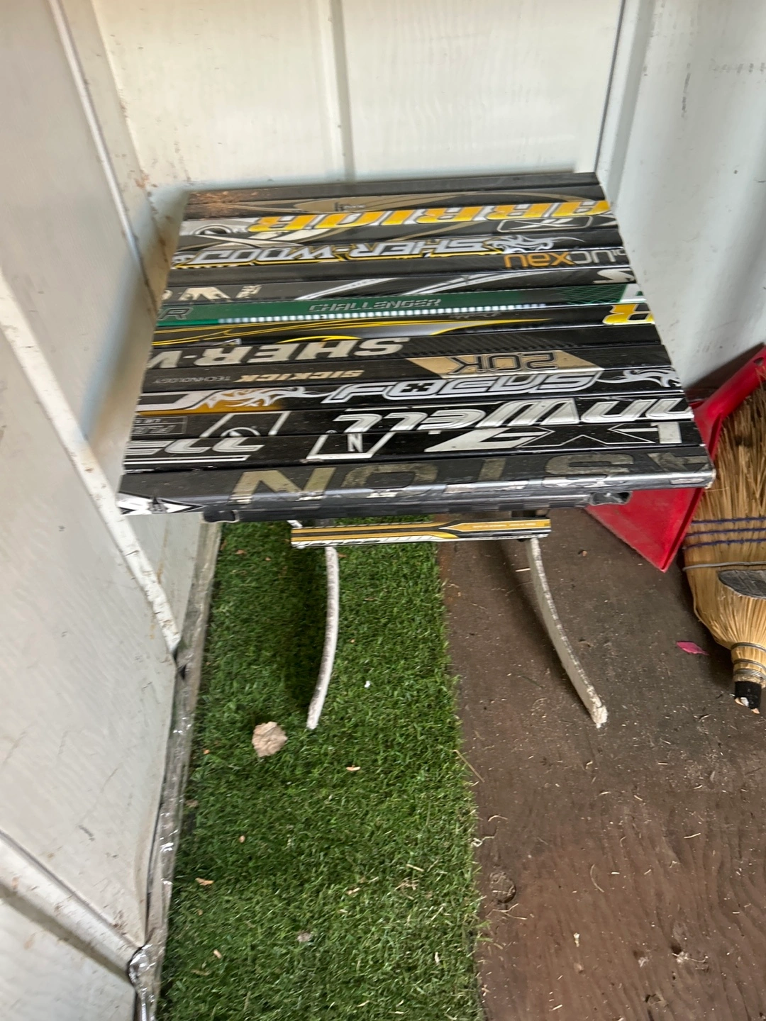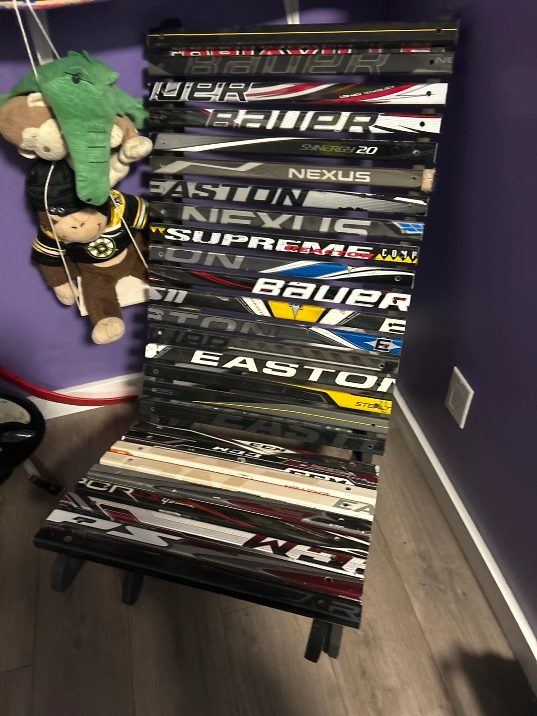 Unique chair made from hockey sticks. Multiple brands represented. Great conversation piece. Some wear and tear expected.