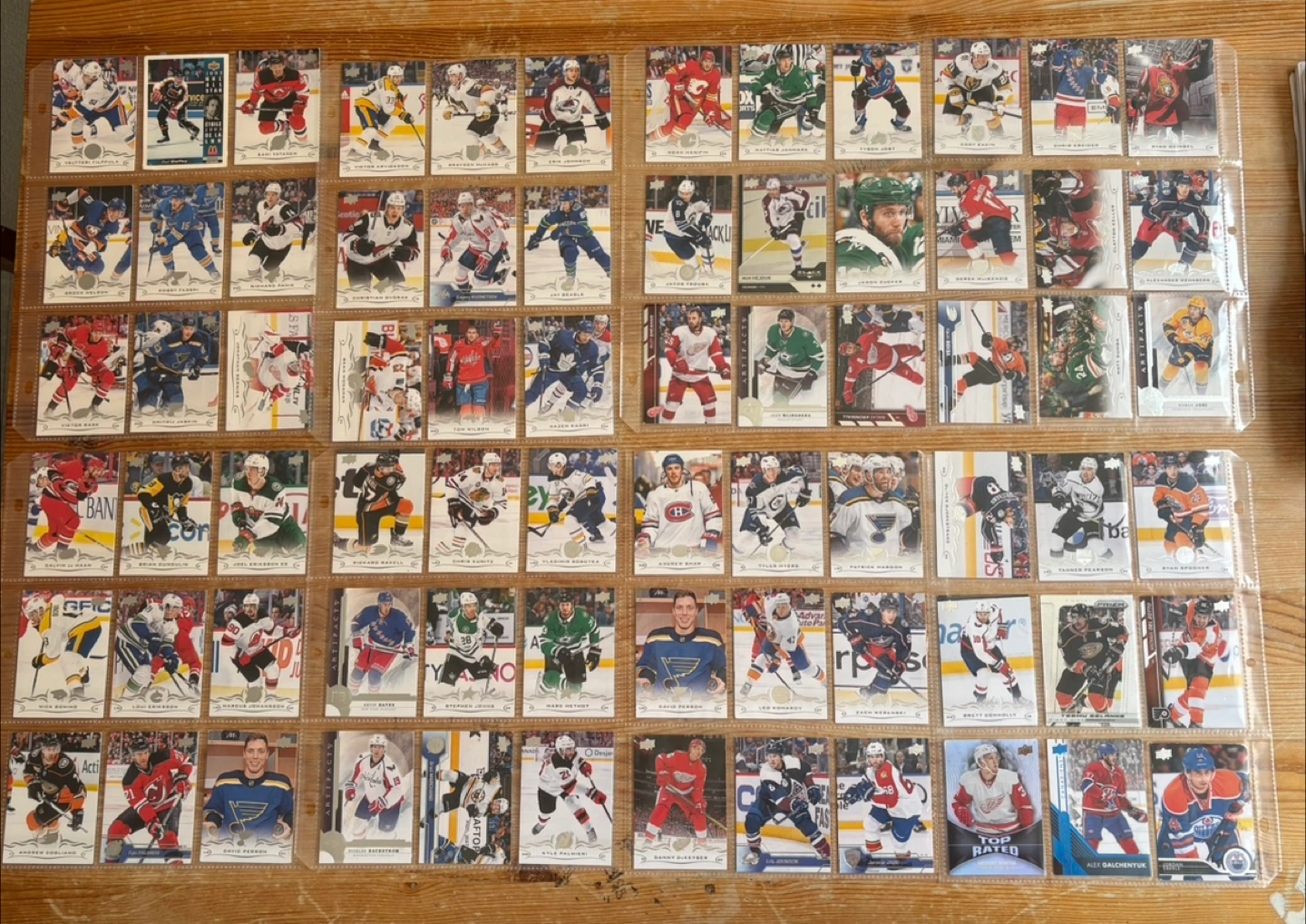 I have a collection of hockey trading cards for sale. They feature various players and teams. If you are a hockey fan or collector, these cards might be of interest to you. 5 for each set of 9 cards or 30 for all.
