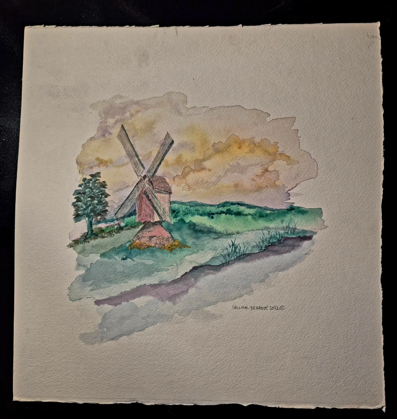 Original Watercolor painting depicting a windmill in a scenic landscape. Signed by William DeGroot in 2022. Artwork on textured paper. 200 lb Windsor Newton watercolor paper archival acid free size 13 inches × 14 inches