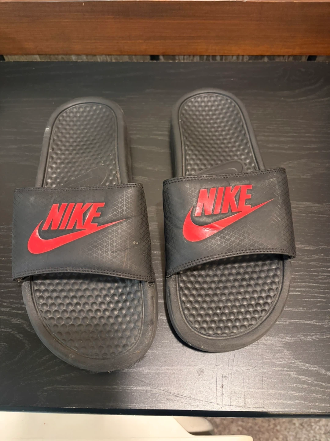 These are a pair of black Nike Benassi Just Do It slide sandals. They're designed for comfort and ease of wear. Perfect for casual outings or post-workout relaxation!