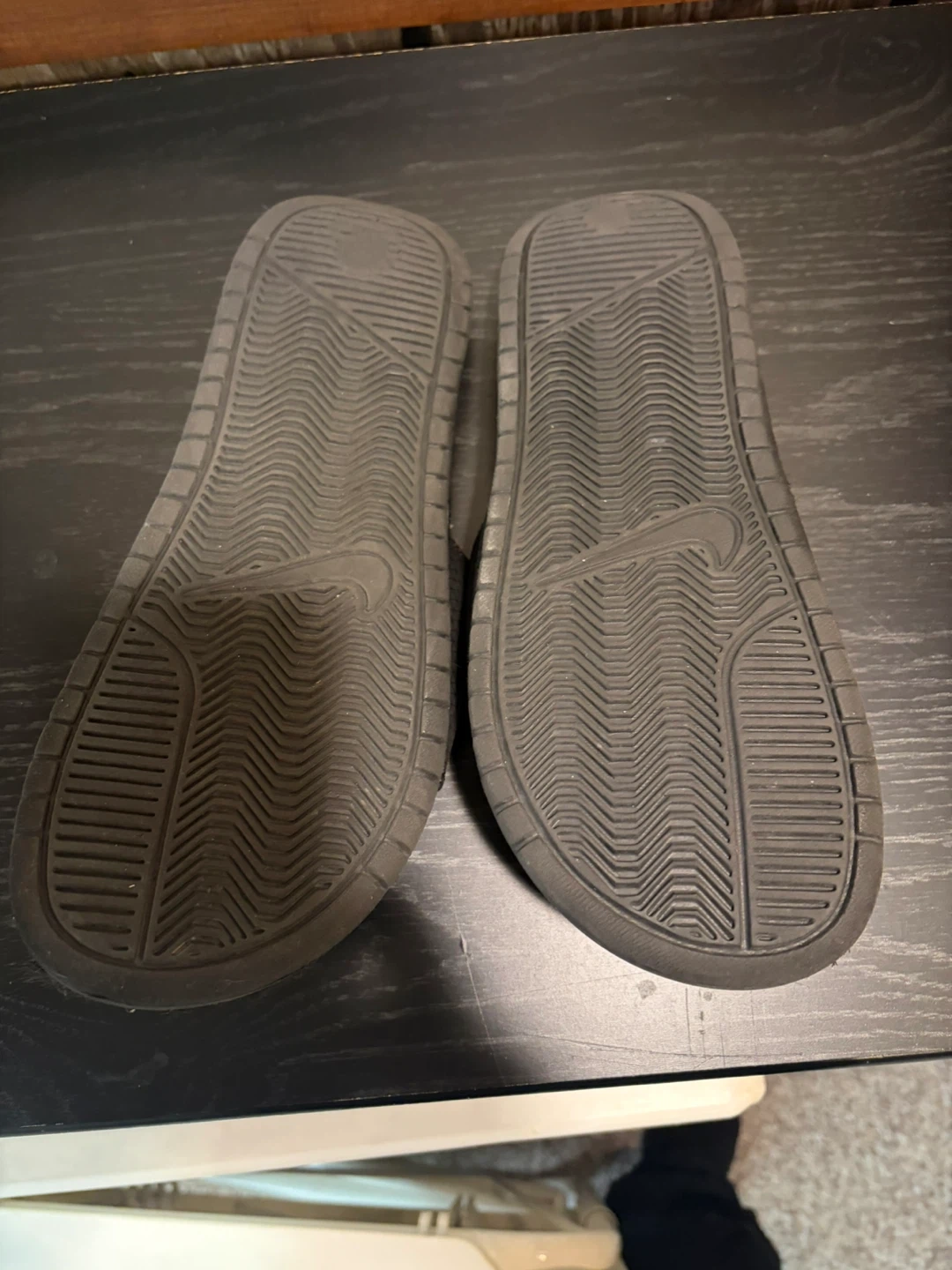 These are a pair of black Nike Benassi Just Do It slide sandals. They're designed for comfort and ease of wear. Perfect for casual outings or post-workout relaxation!