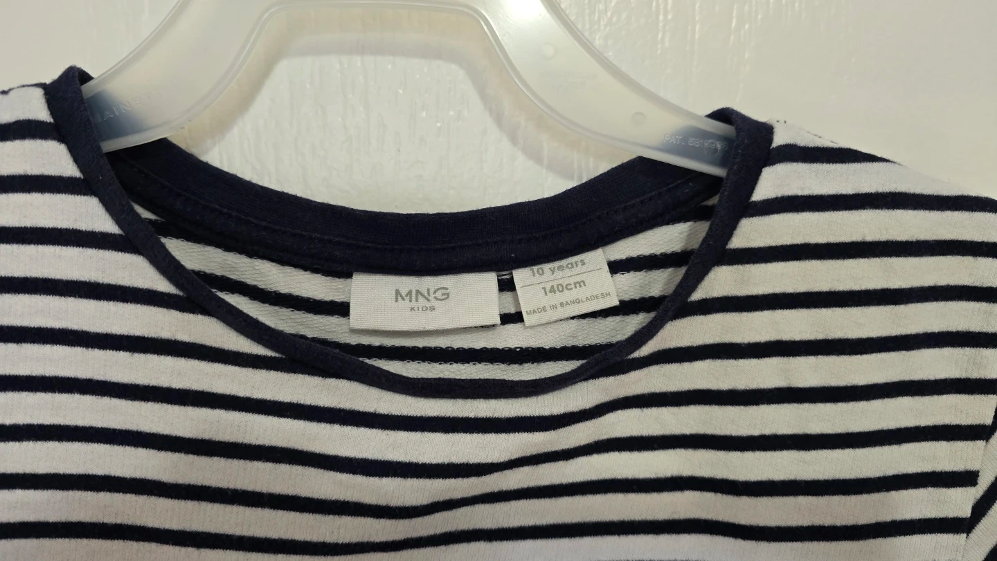 This Mango Kids dress features a classic navy and white stripe pattern. It's designed with short sleeves and two front pockets. Made from comfortable fabric, it's great for everyday wear.