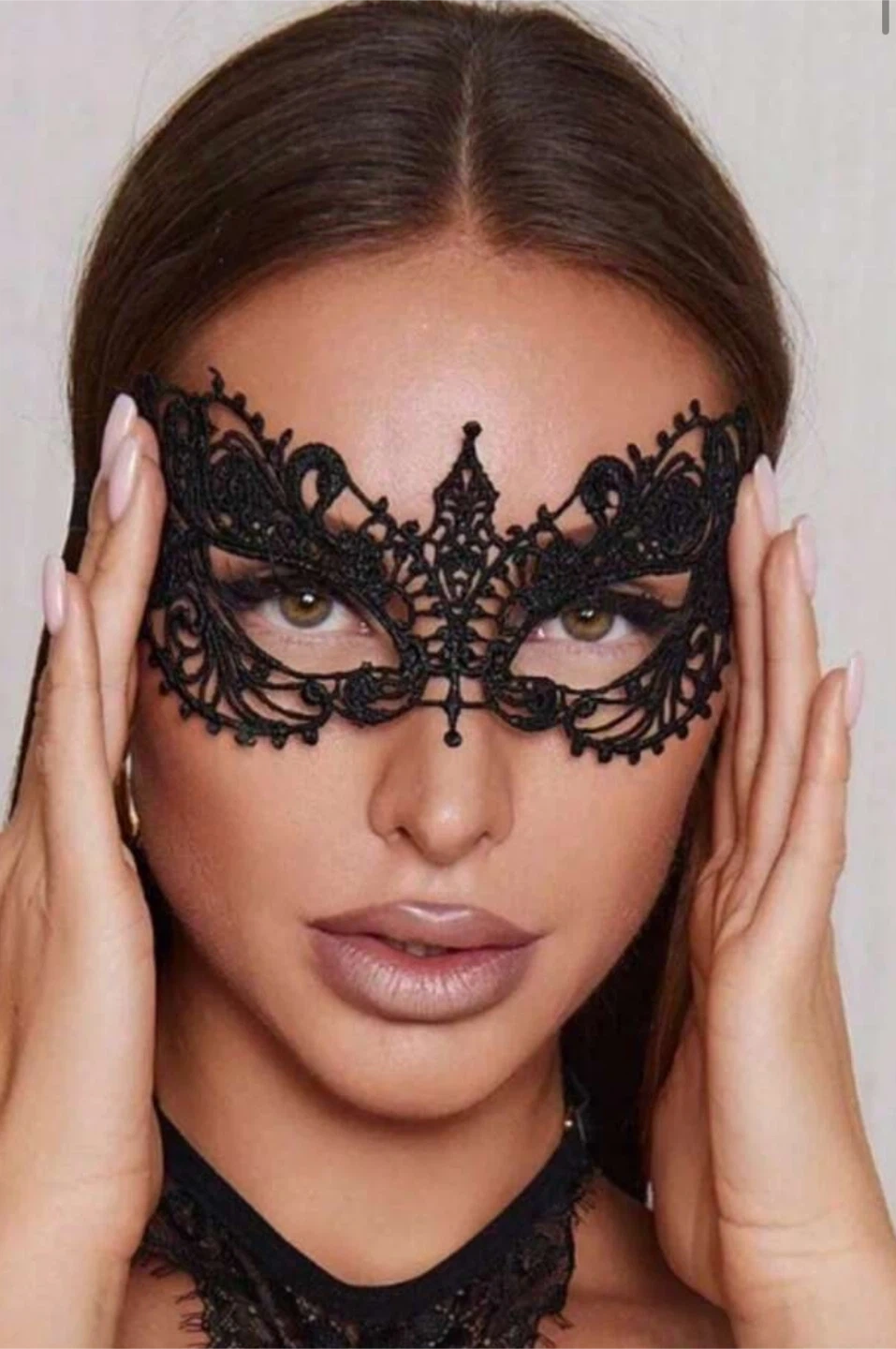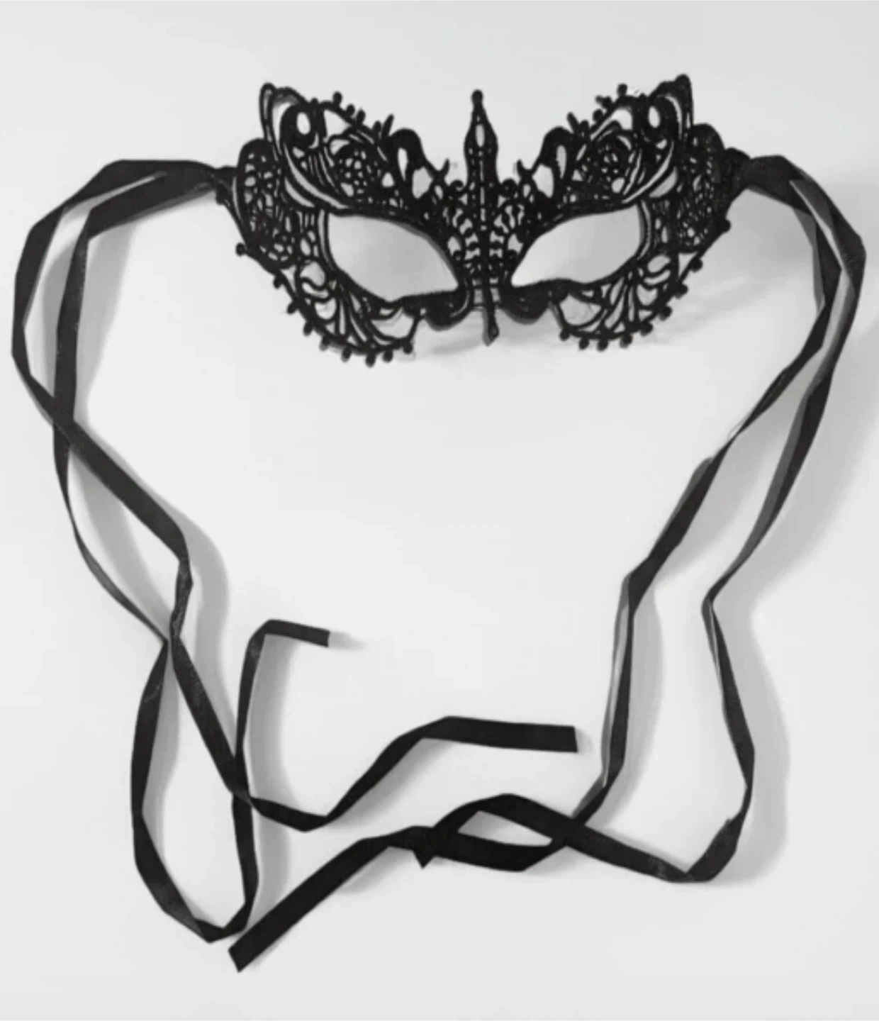 This is a black lace masquerade mask with ribbons for tying. It's made of delicate lace material. Perfect for costume parties or events! Never used