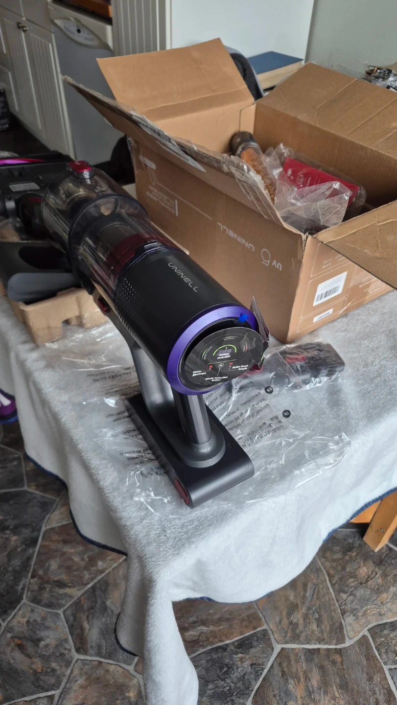 This UNINELL,550W Home Cordless Vacuum Cleaner turbo mode very strong, with digital touch screen, is designed for efficient cleaning. It's rechargeable and suitable for home and pet hair. Includes various attachments for different surfaces.
