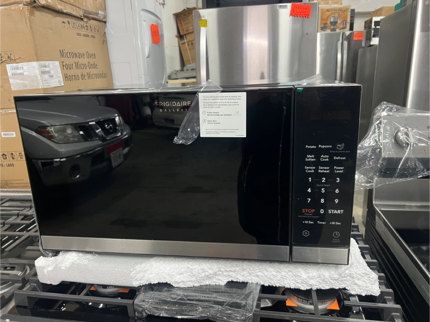 This is a black Frigidaire Gallery microwave. It has a digital display with preset cooking options for potatoes, popcorn, and defrost. Includes timer and quick start functions. A kitchen essential!
