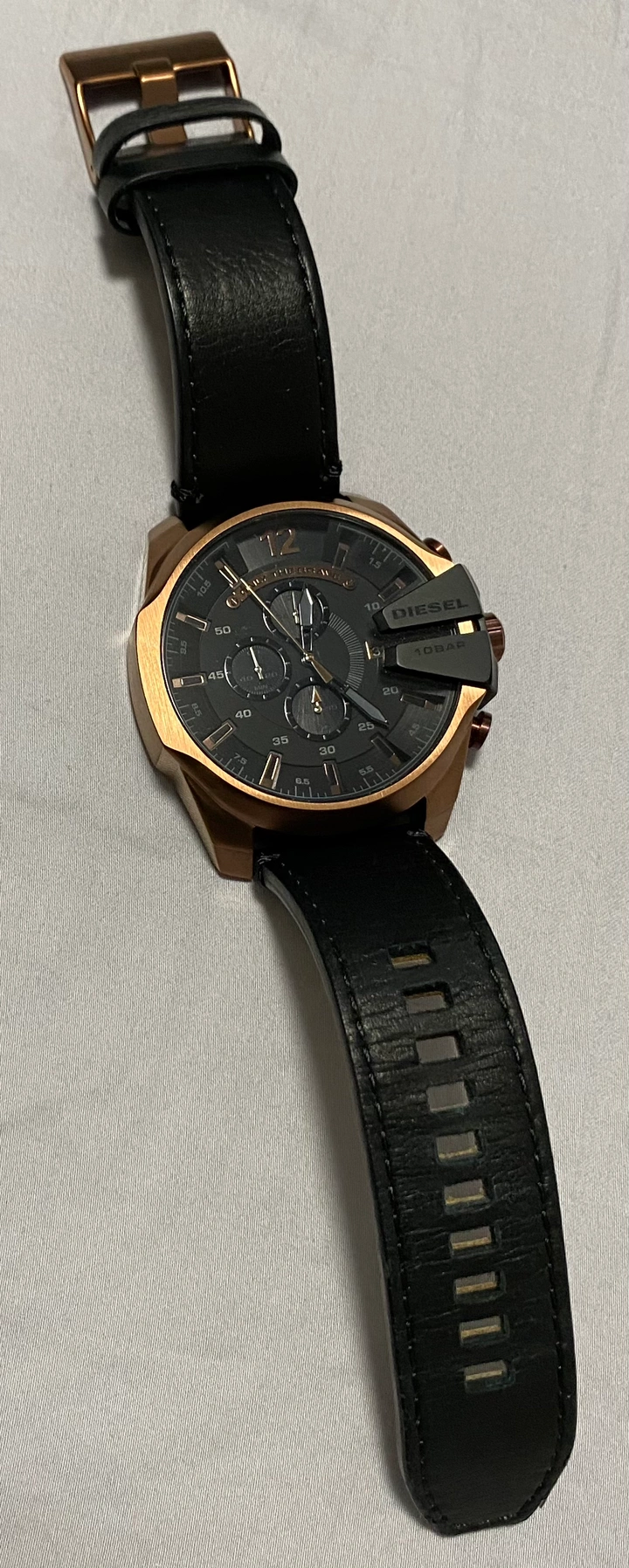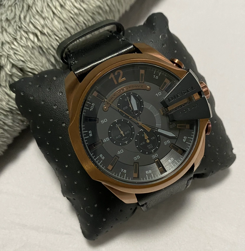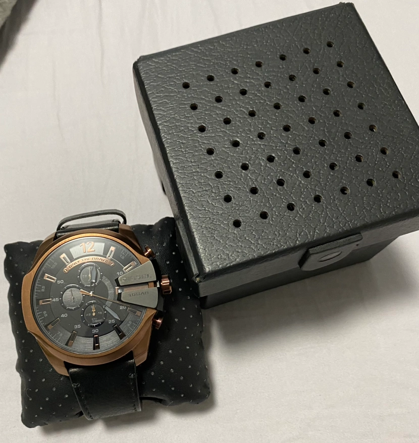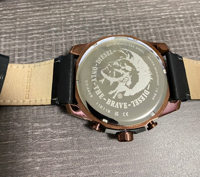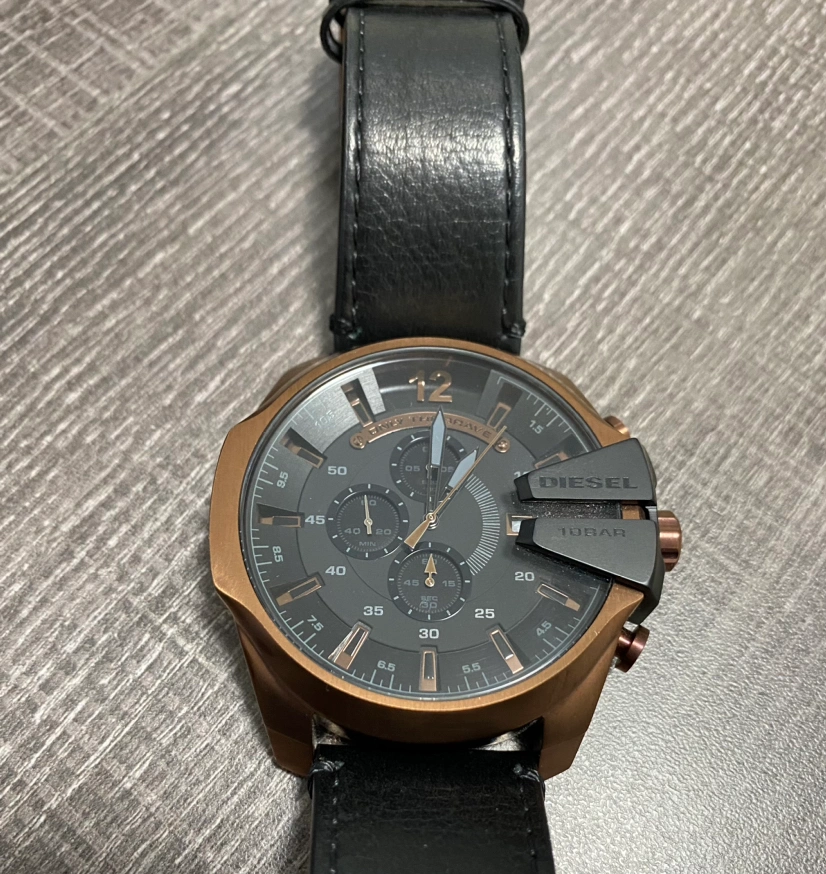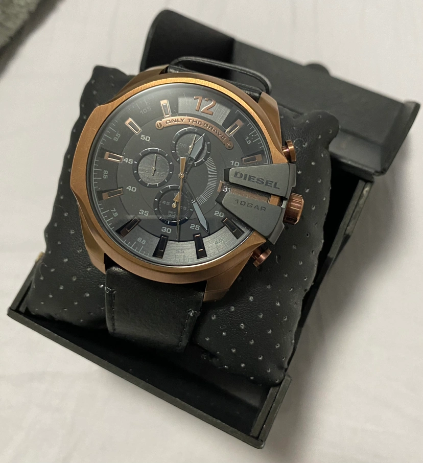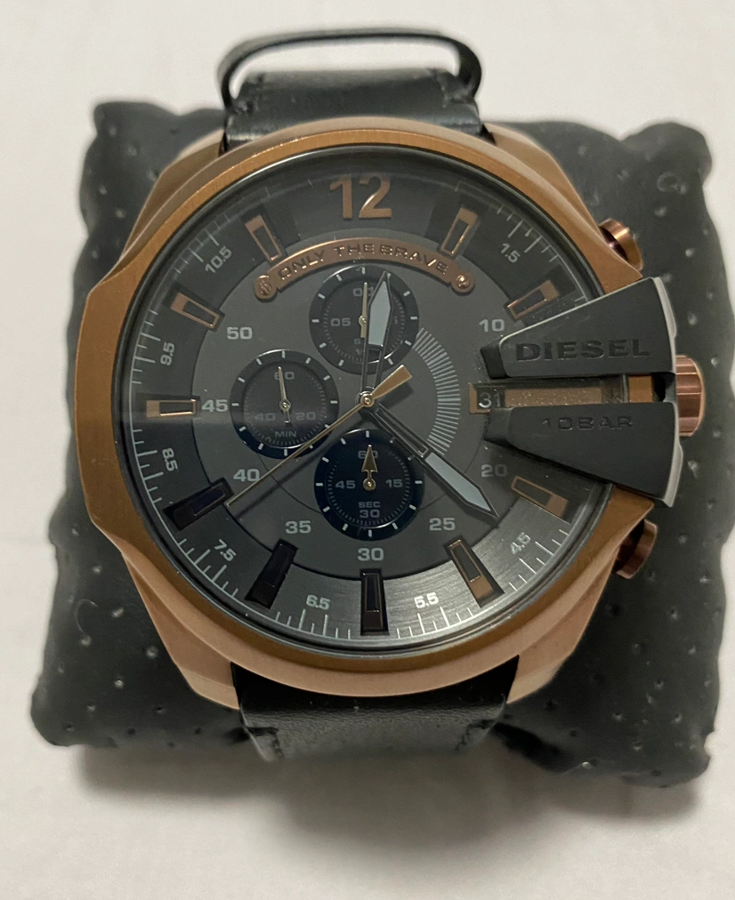Brand new Diesel leather Chronograph watch. Genuine black leather band, water resistant to 330 feet, suitable for swimming and snorkeling.