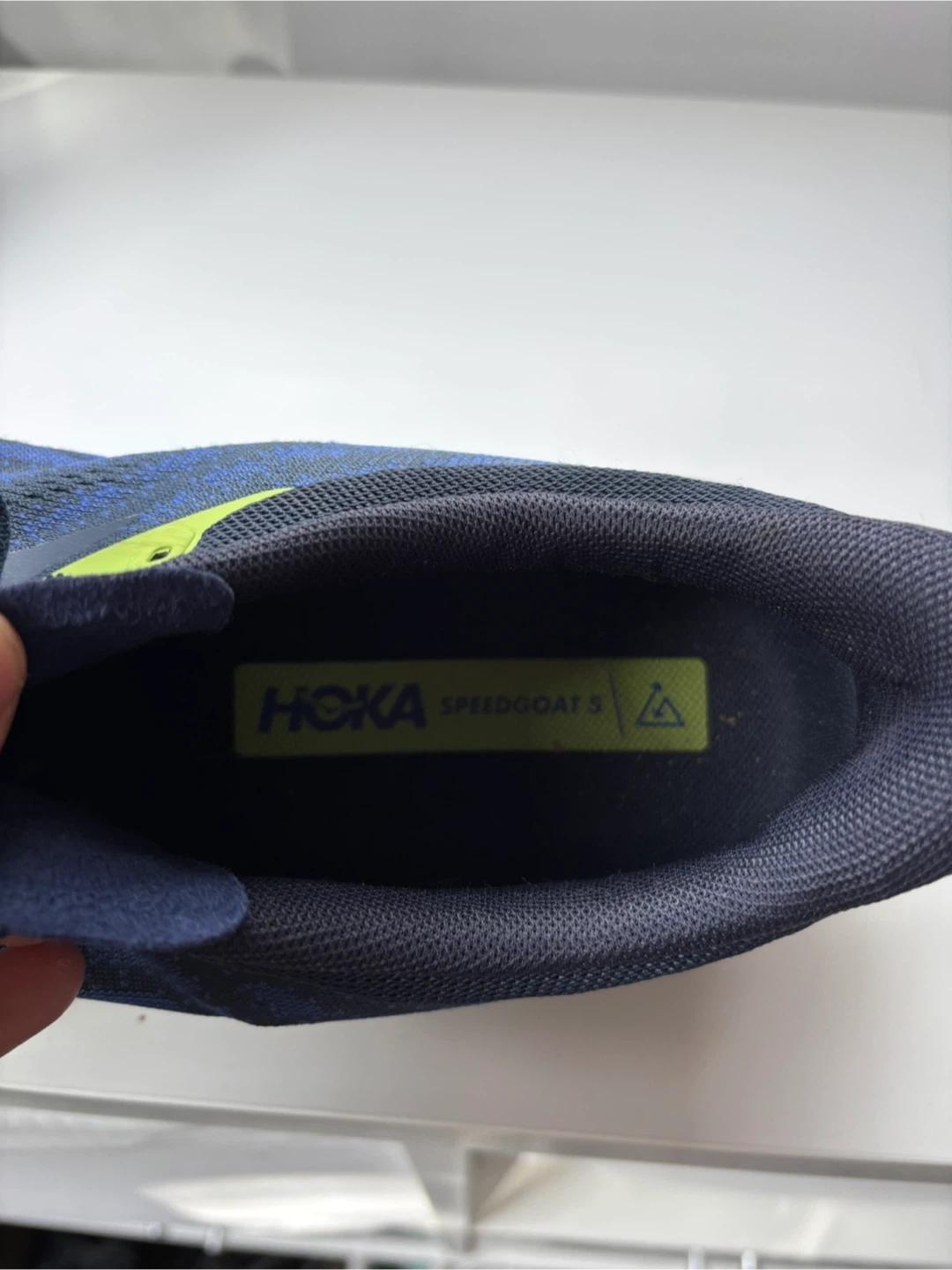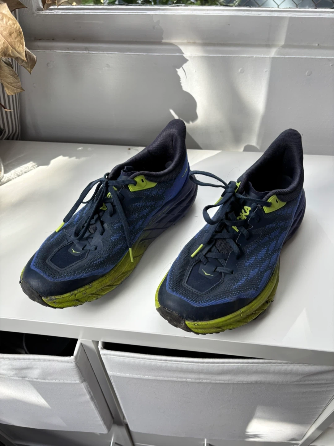 120Selling a pair of Hoka Speedgoat 5 trail running shoes in US size 10.5. These shoes are great for hitting the trails! They show some signs of use, but have lots of life left. The soles have good traction. Ready for your next adventure!