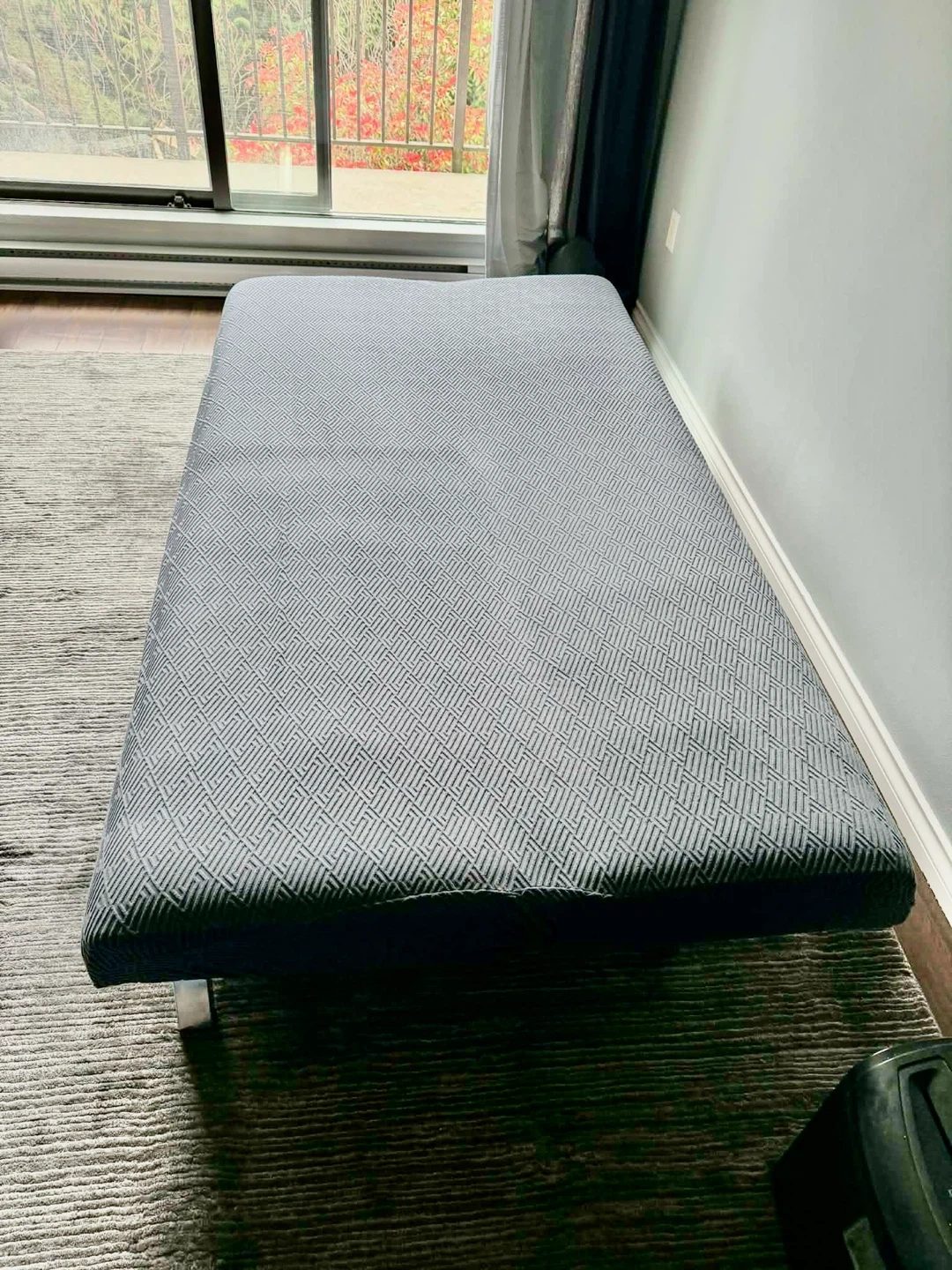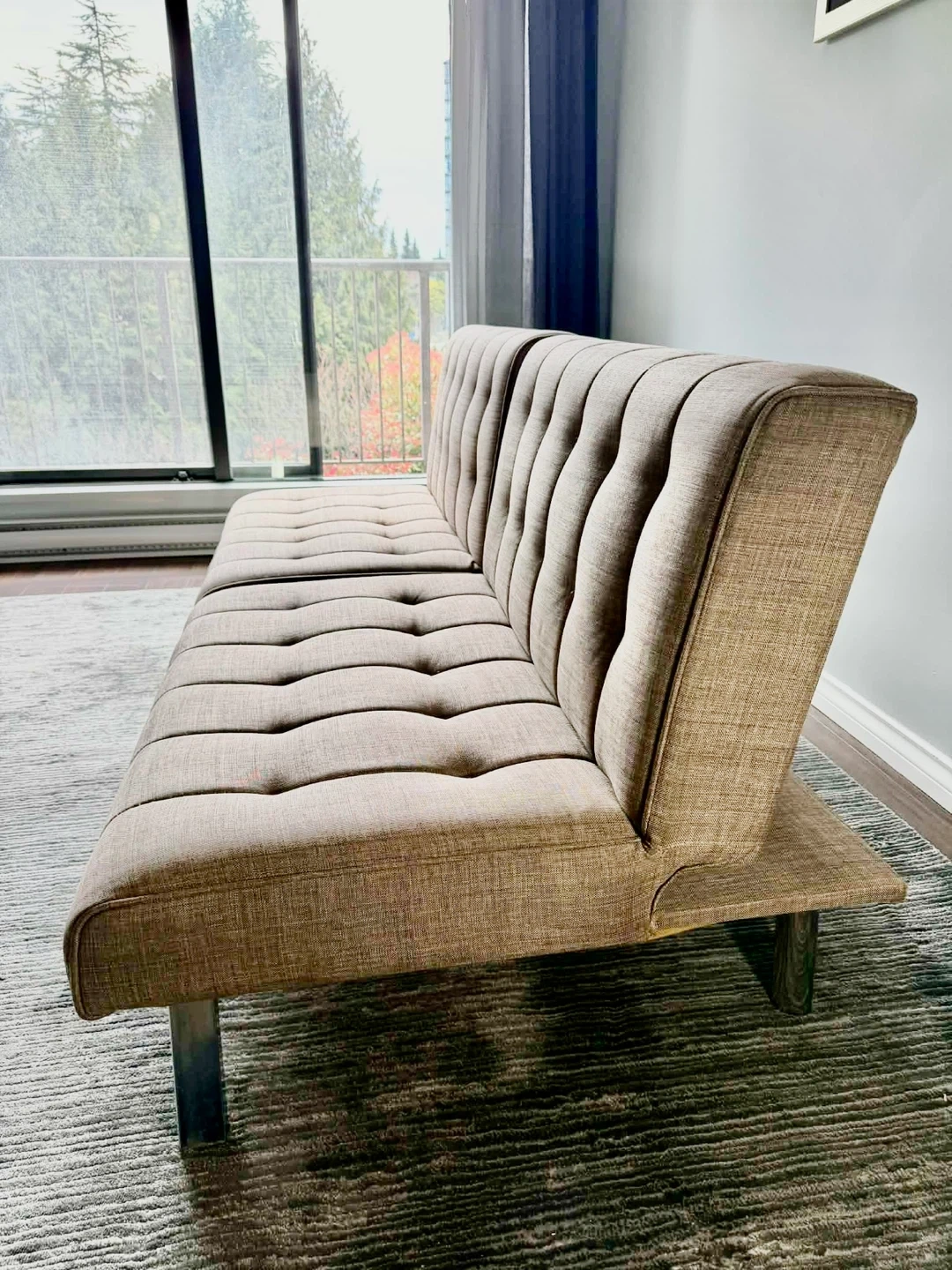 This is a beige upholstered futon sofa with button tufting. It's designed with sleek metal legs for a modern look. This piece easily converts into a sofa bed for added functionality!