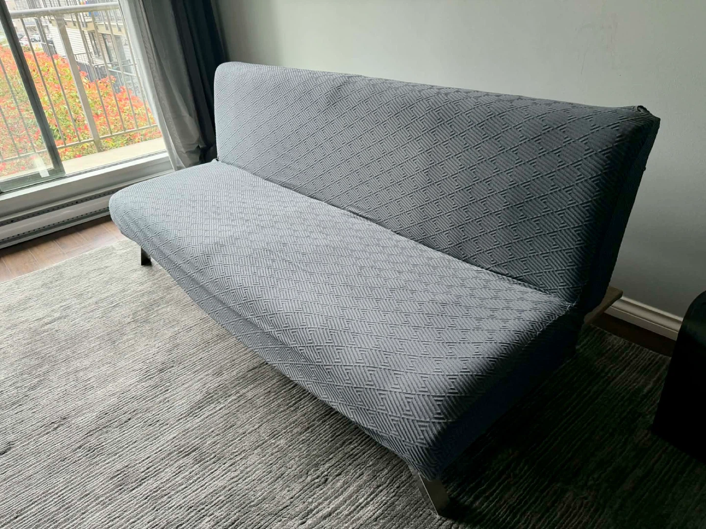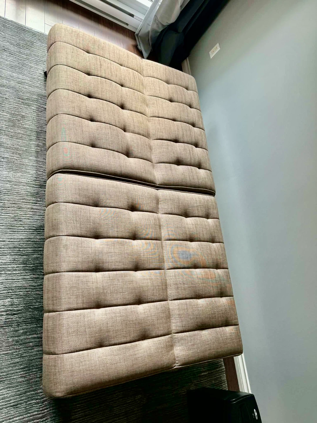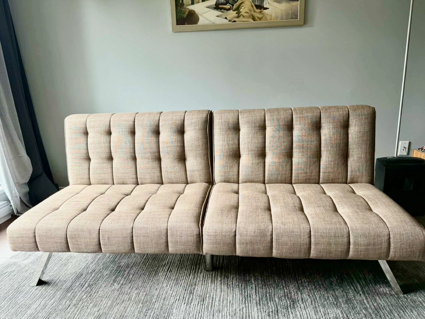 This is a beige upholstered futon sofa with button tufting. It's designed with sleek metal legs for a modern look. This piece easily converts into a sofa bed for added functionality!
