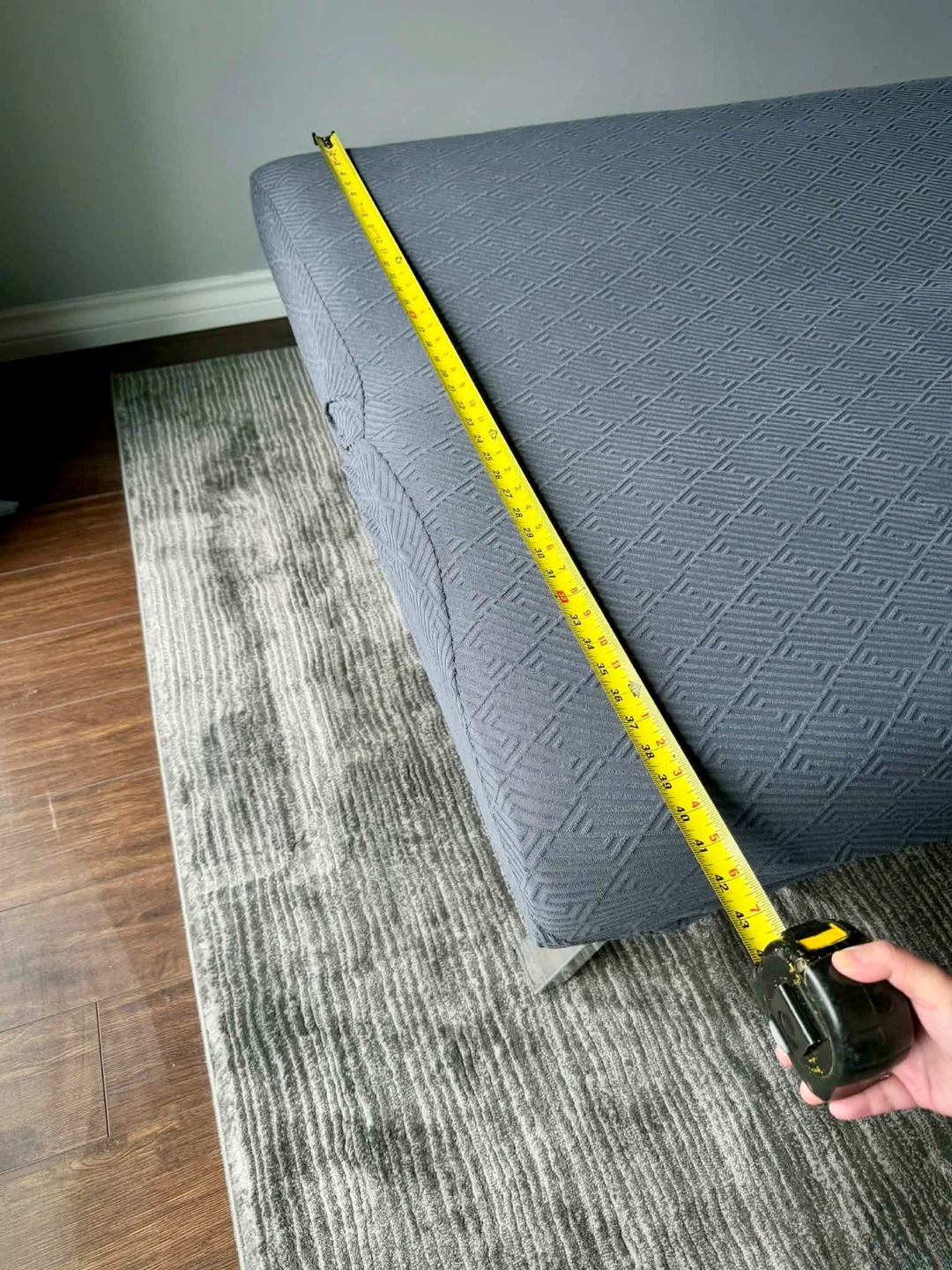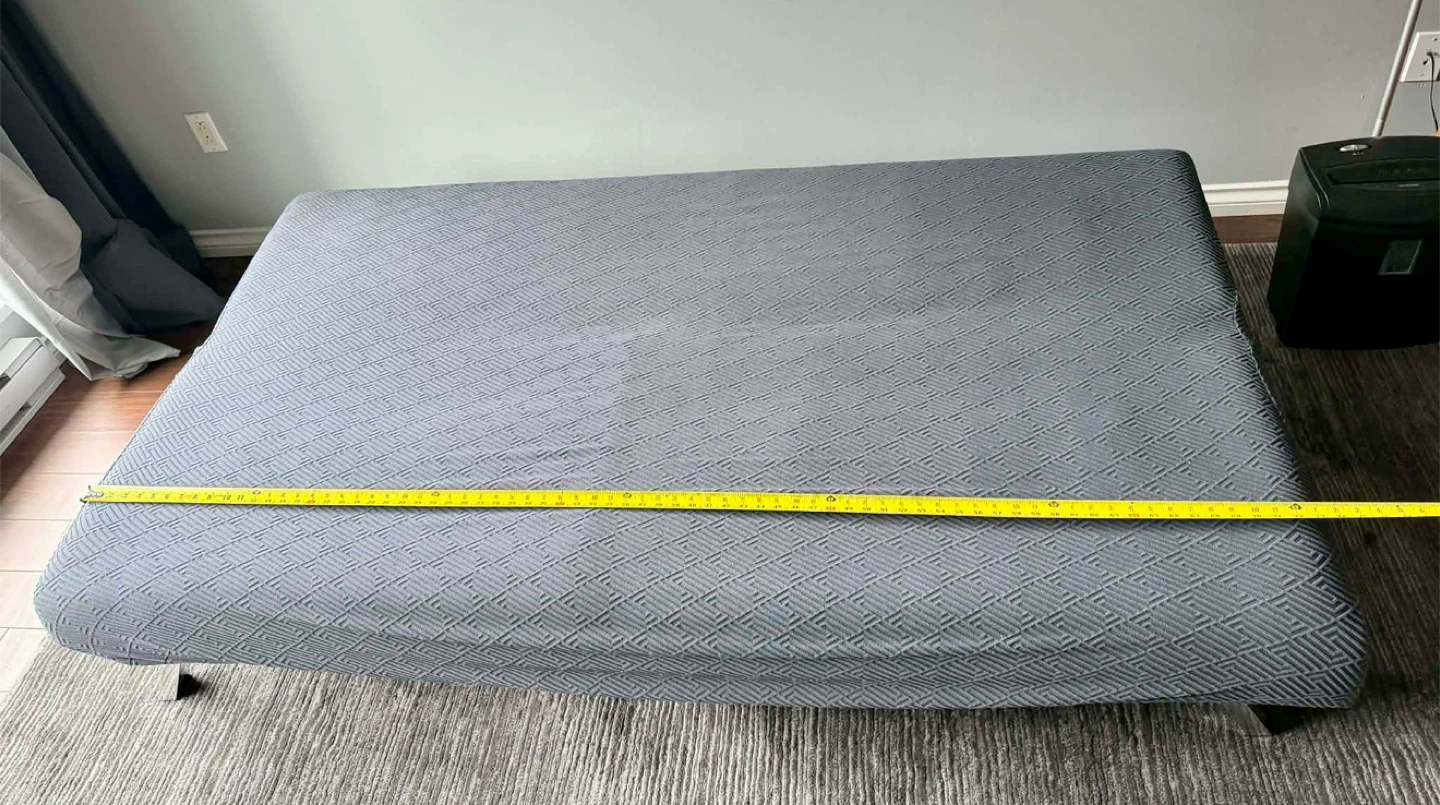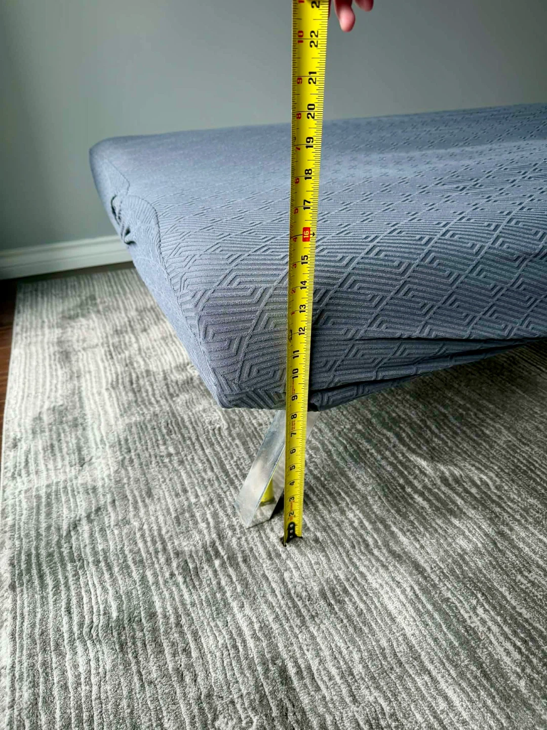 This is a beige upholstered futon sofa with button tufting. It's designed with sleek metal legs for a modern look. This piece easily converts into a sofa bed for added functionality!
