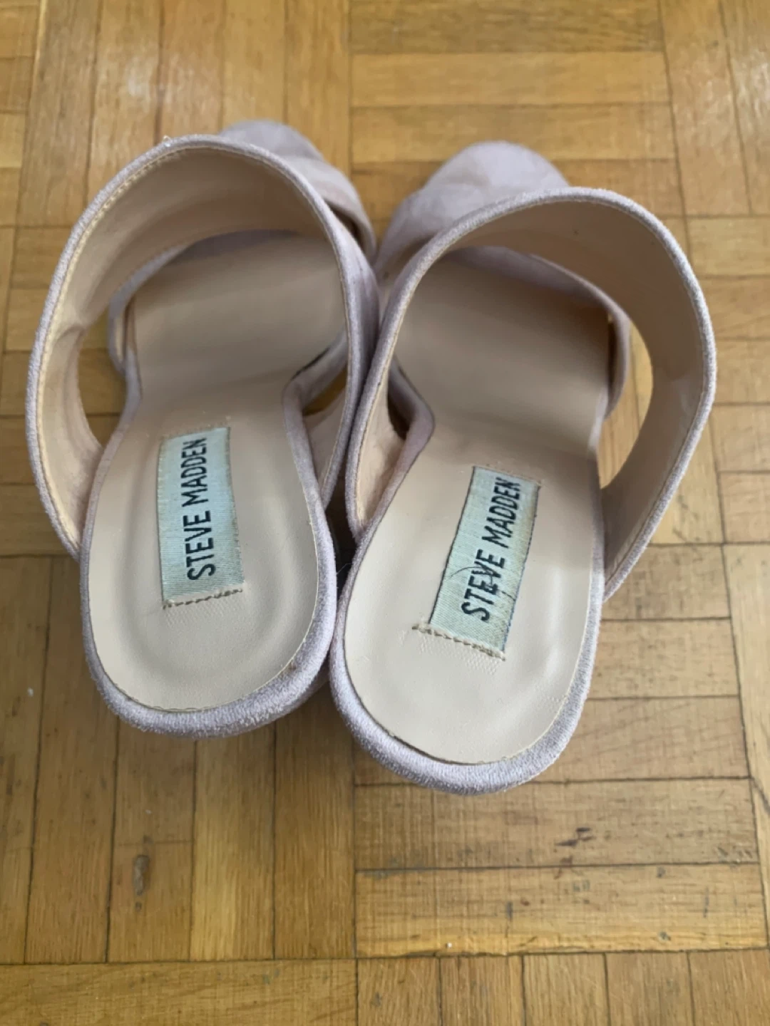 Light pink Steve Madden heeled sandals with a block heel. Suede-like material on the straps. Perfect for dressing up an outfit!