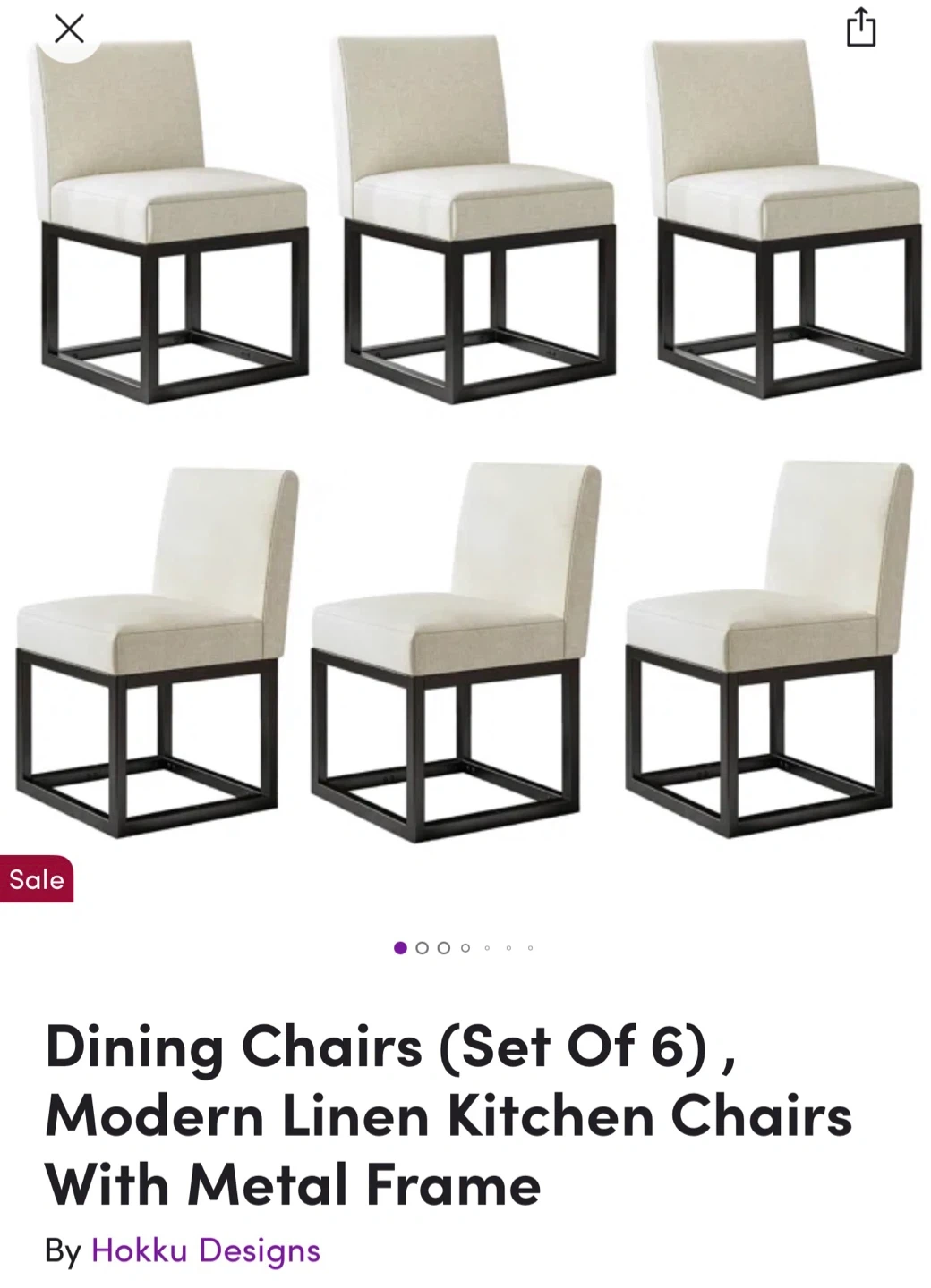 18Smoke free, pet free home all chairs have been steamed clean . Selling a set of six modern linen kitchen chairs by Hokku Designs. They feature a sleek metal frame and a comfortable linen seat. Perfect for adding a touch of modern elegance to your dining space!
