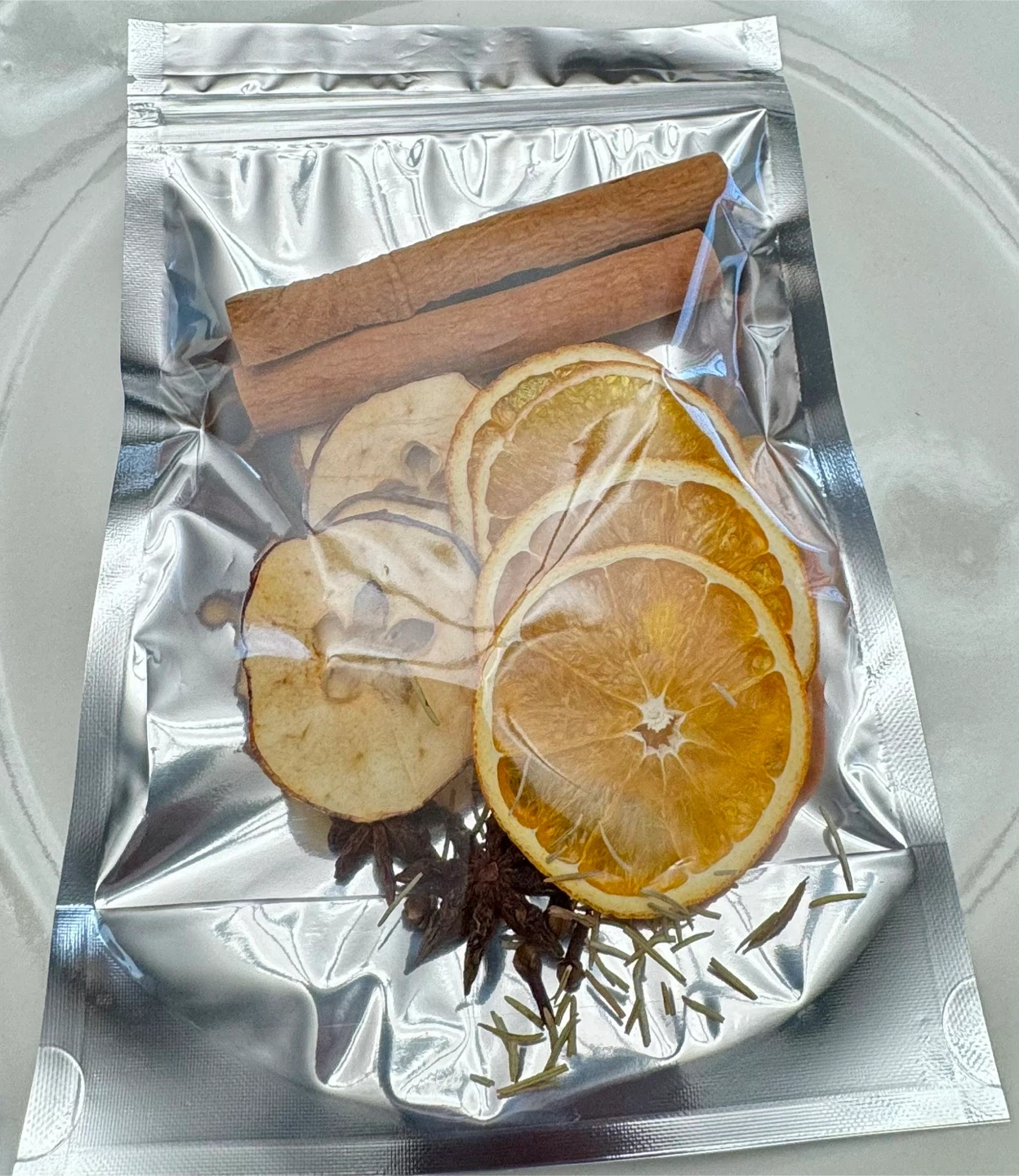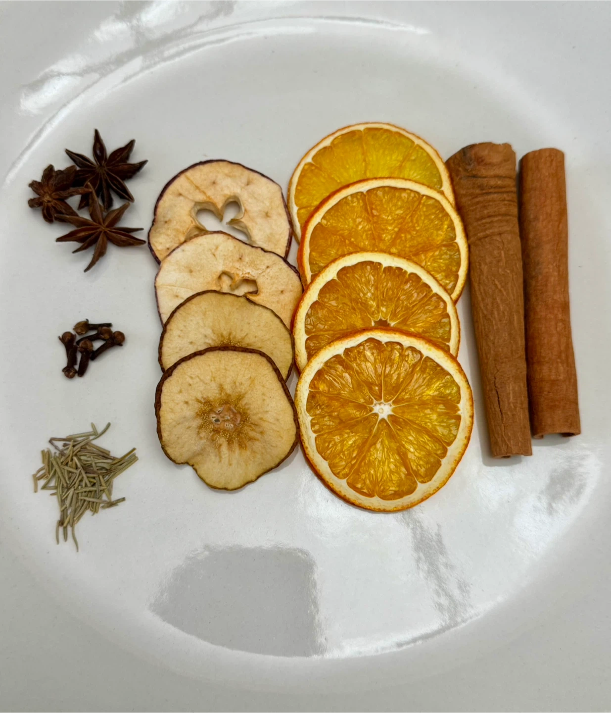 249Aromatic mix of dried apples, oranges, cinnamon sticks, star anise, cloves, and rosemary. Perfect for adding a natural fragrance to your home or for crafting projects! Great for the holidays