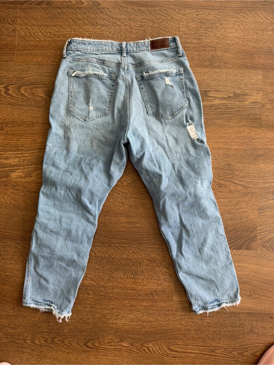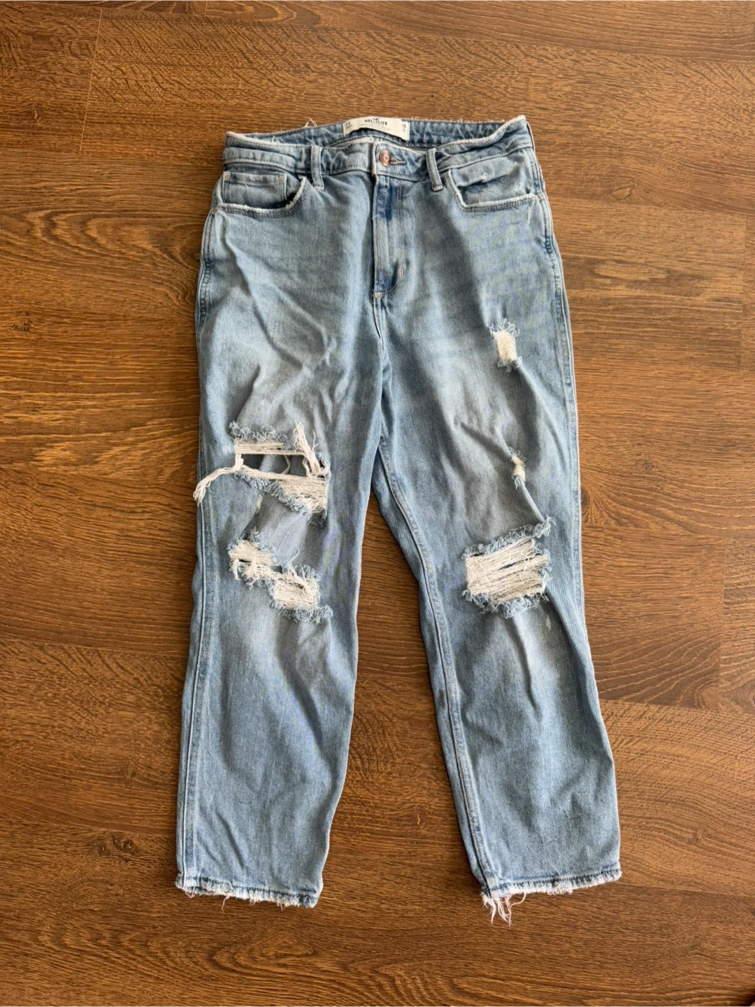 Selling a pair of Hollister Curvy High-Rise Mom Jeans in a size 7S. These are the Hollister Vintage Stretch jeans, perfect for a comfortable and stylish fit. They feature a light wash and distressed detailing. Great for a casual look!