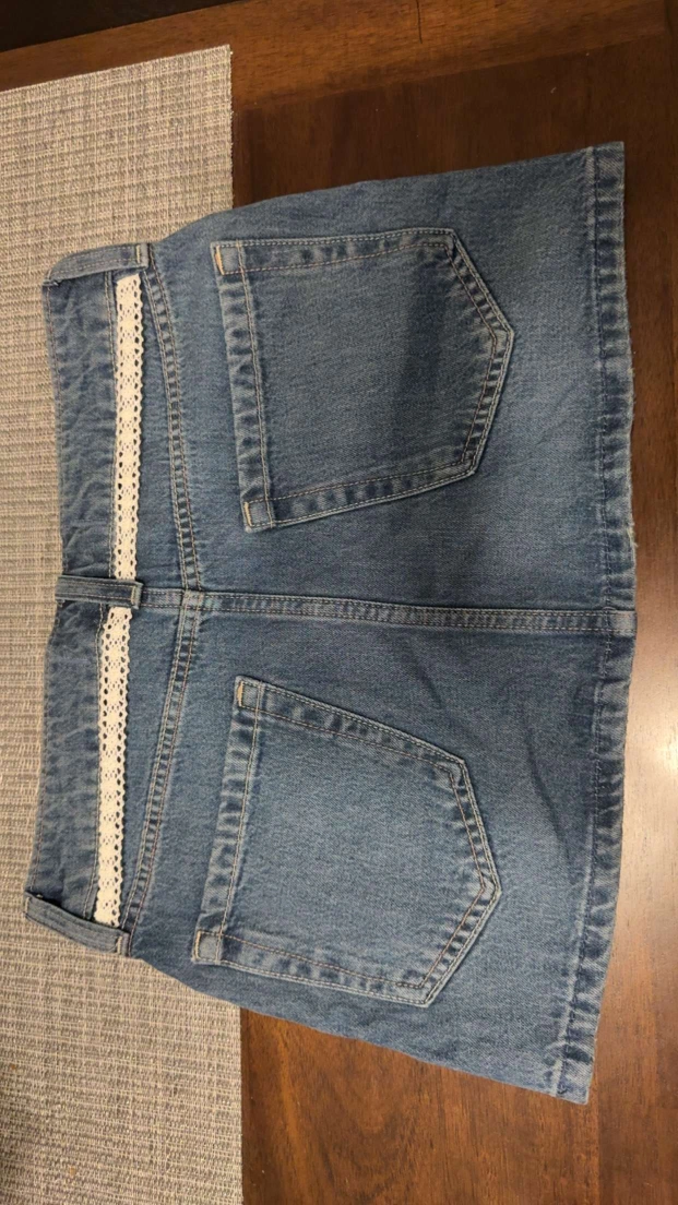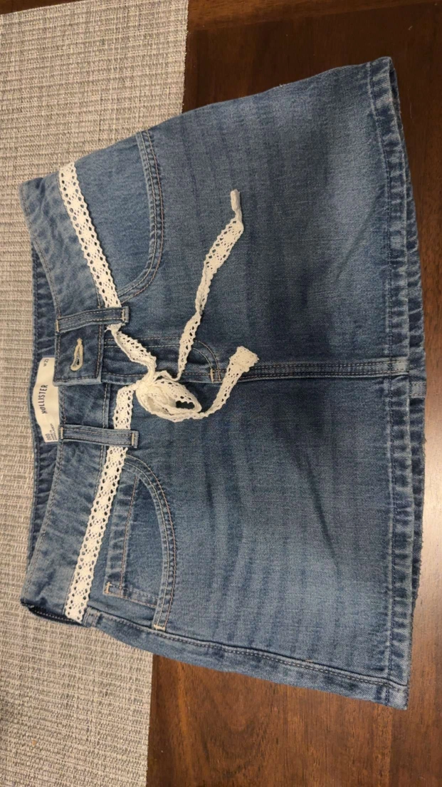 Selling a cute Hollister denim mini skirt! It features a stylish lace-up detail at the front. Perfect for a casual, trendy look!